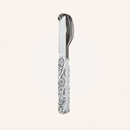 Besteck aus martensitischem Edelstahl 2CR14, hochglanzpoliert. Bestehend aus einem großen Löffel, einer 4-zahnigen Gabel und einem Messer mit einer mikroverzahnten Klinge. Dekorierter, transparenter Polymer (PC)-Griff. Fixierung mittels verbautem Magnet. Geliefert mit einem Trageetui aus Hartpolypropylen (PP). Spülmaschinenfest.