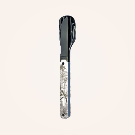 Besteck aus martensitischem Edelstahl 2CR14, hochglanz schwarz. Bestehend aus einem großen Löffel, einer 4-zahnigen Gabel und einem Messer mit einer mikroverzahnten Klinge. Dekorierter, transparenter Polymer (PC)-Griff. Fixierung mittels verbautem Magnet. Geliefert mit einem Trageetui aus Hartpolypropylen (PP). Spülmaschinenfest.