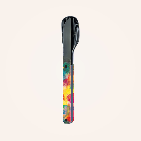 Besteck aus martensitischem Edelstahl 2CR14, hochglanz schwarz. Bestehend aus einem großen Löffel, einer 4-zahnigen Gabel und einem Messer mit einer mikroverzahnten Klinge. Dekorierter, transparenter Polymer (PC)-Griff. Fixierung mittels verbautem Magnet. Geliefert mit einem Trageetui aus Hartpolypropylen (PP). Spülmaschinenfest.