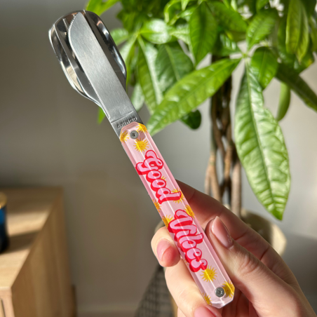 Besteck aus martensitischem Edelstahl 2CR14, hochglanzpoliert. Bestehend aus einem großen Löffel, einer 4-zahnigen Gabel und einem Messer mit einer mikroverzahnten Klinge. Dekorierter, transparenter Polymer (PC)-Griff. Fixierung mittels verbautem Magnet.