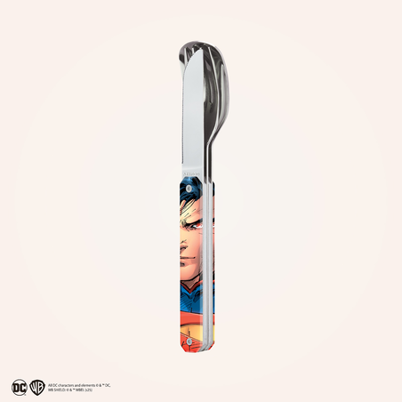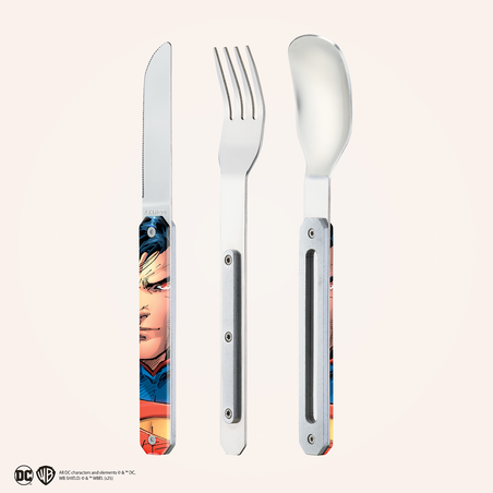 Besteck aus martensitischem Edelstahl 2CR14, hochglanzpoliert. Bestehend aus einem großen Löffel, einer 4-zahnigen Gabel und einem Messer mit einer mikroverzahnten Klinge. Dekorierter, transparenter Polymer (PC)-Griff. Fixierung mittels verbautem Magnet. Spüllmaschinenfest.