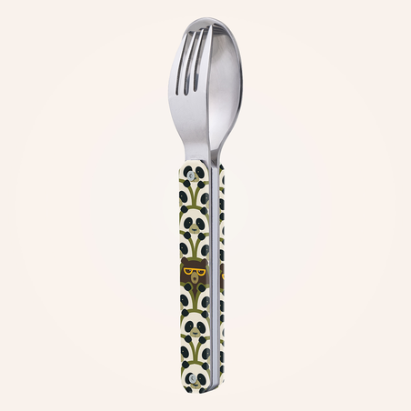 Besteck aus martensitischem Edelstahl 2CR14, hochglanzpoliert. Bestehend aus einem Löffel und einer 4-zahnigen Gabel. Dekorierter, transparenter Polymer (PC)-Griff. Fixierung mittels verbautem Magnet. Geliefert mit einem Trageetui aus Hartpolypropylen (PP). Spülmaschinenfest.