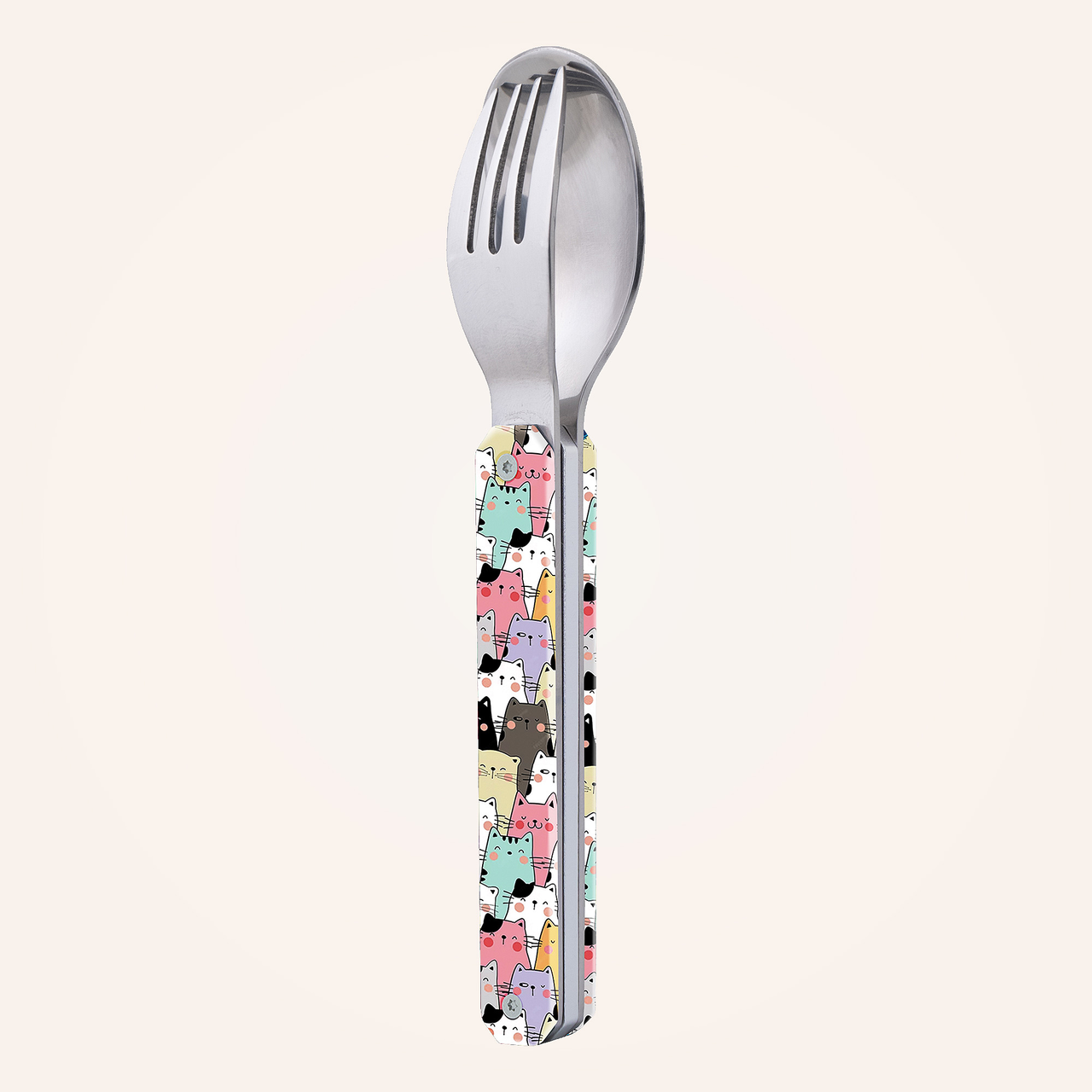 Besteck aus martensitischem Edelstahl 2CR14, hochglanzpoliert. Bestehend aus einem Löffel und einer 4-zahnigen Gabel. Dekorierter, transparenter Polymer (PC)-Griff. Fixierung mittels verbautem Magnet. Geliefert mit einem Trageetui aus Hartpolypropylen (PP). Spülmaschinenfest.