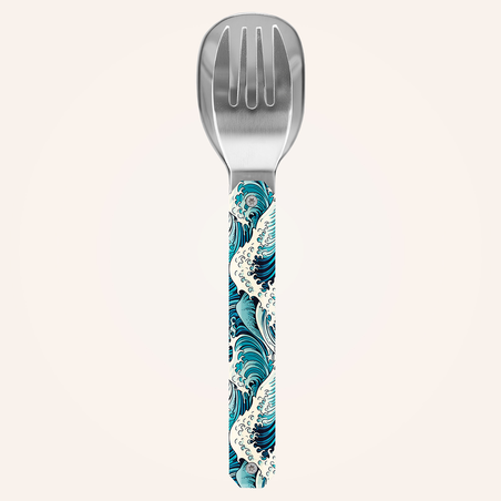 Besteck aus martensitischem Edelstahl 2CR14, hochglanzpoliert. Bestehend aus einem Löffel und einer 4-zahnigen Gabel. Dekorierter, transparenter Polymer (PC)-Griff. Fixierung mittels verbautem Magnet. Geliefert mit einem Trageetui aus Hartpolypropylen (PP). Spülmaschinenfest.