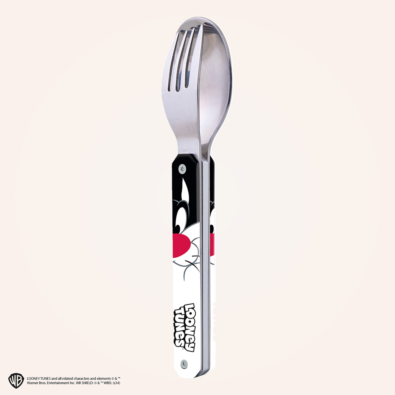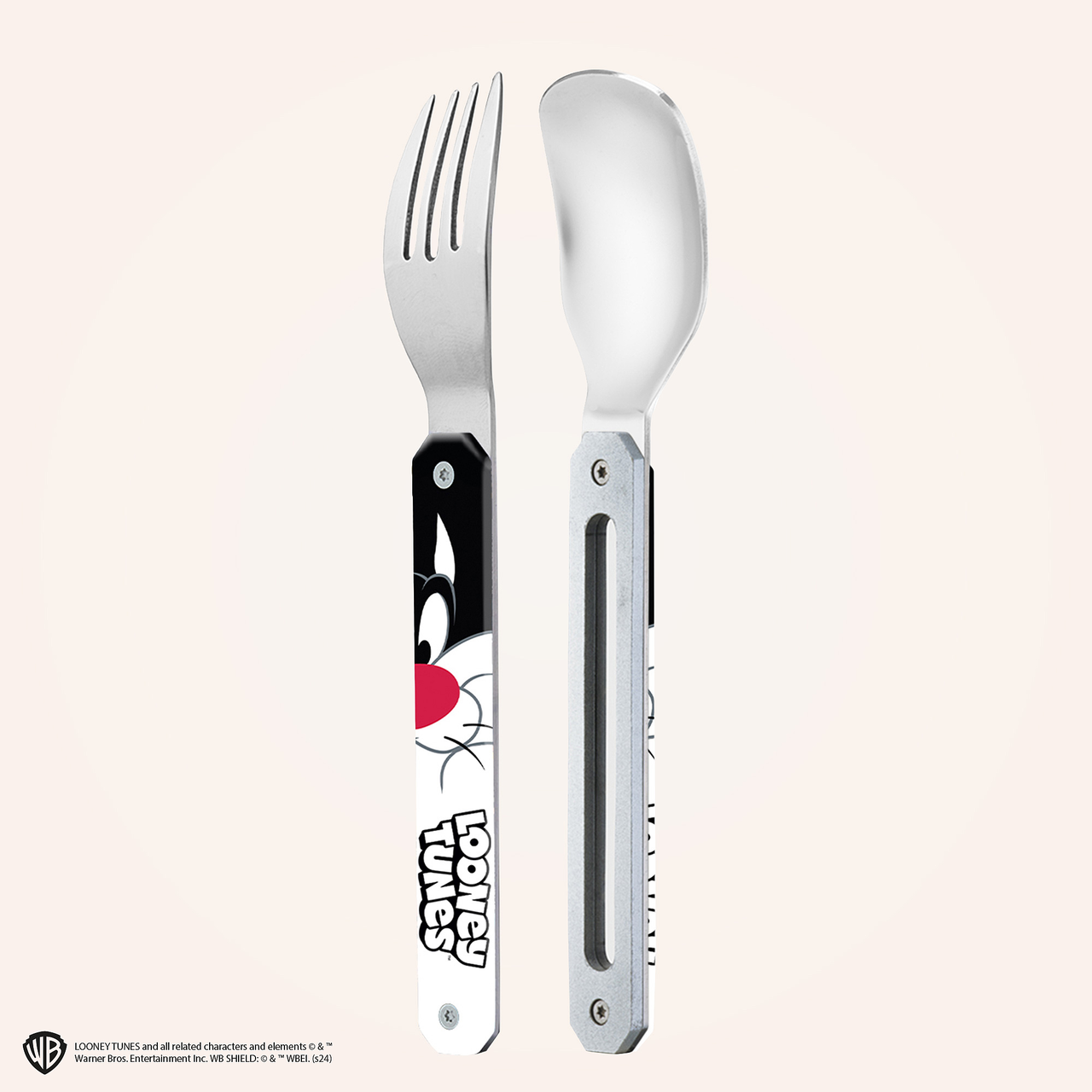 Besteck aus martensitischem Edelstahl 2CR14, hochglanzpoliert. Bestehend aus einem Löffel und einer 4-zahnigen Gabel. Dekorierter, transparenter Polymer (PC)-Griff. Fixierung mittels verbautem Magnet. Geliefert mit einem Trageetui aus Hartpolypropylen (PP). Spülmaschinenfest.