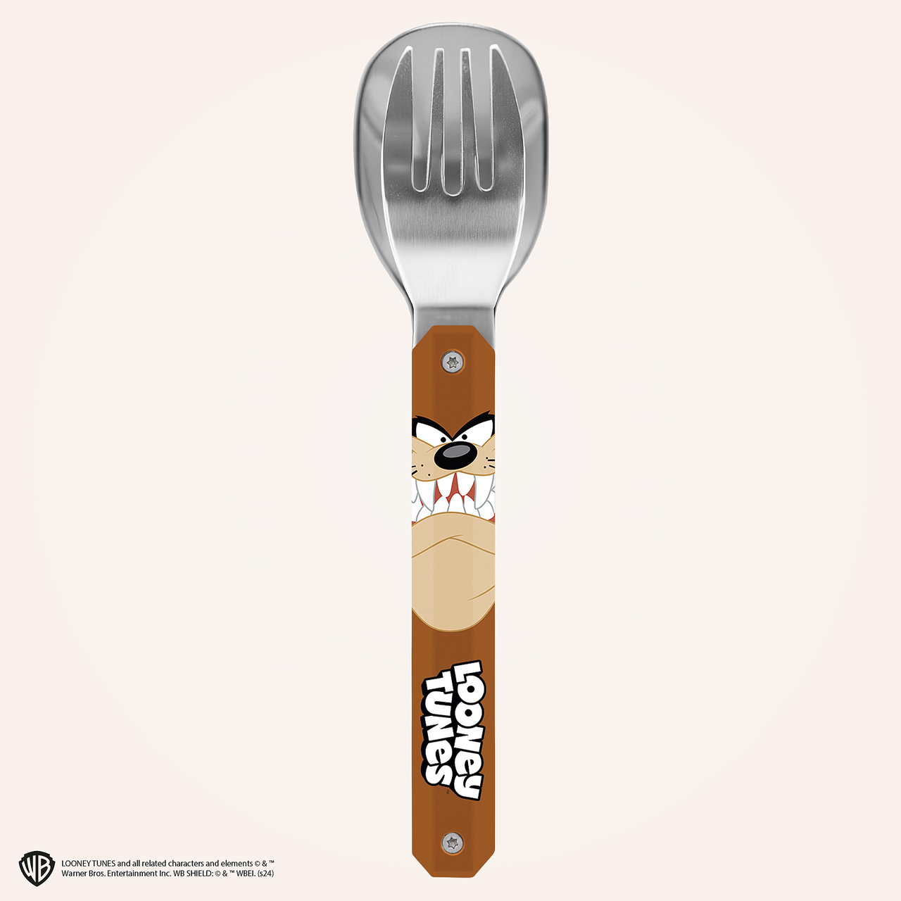 Besteck aus martensitischem Edelstahl 2CR14, hochglanzpoliert. Bestehend aus einem Löffel und einer 4-zahnigen Gabel. Dekorierter, transparenter Polymer (PC)-Griff. Fixierung mittels verbautem Magnet. Geliefert mit einem Trageetui aus Hartpolypropylen (PP). Spülmaschinenfest.