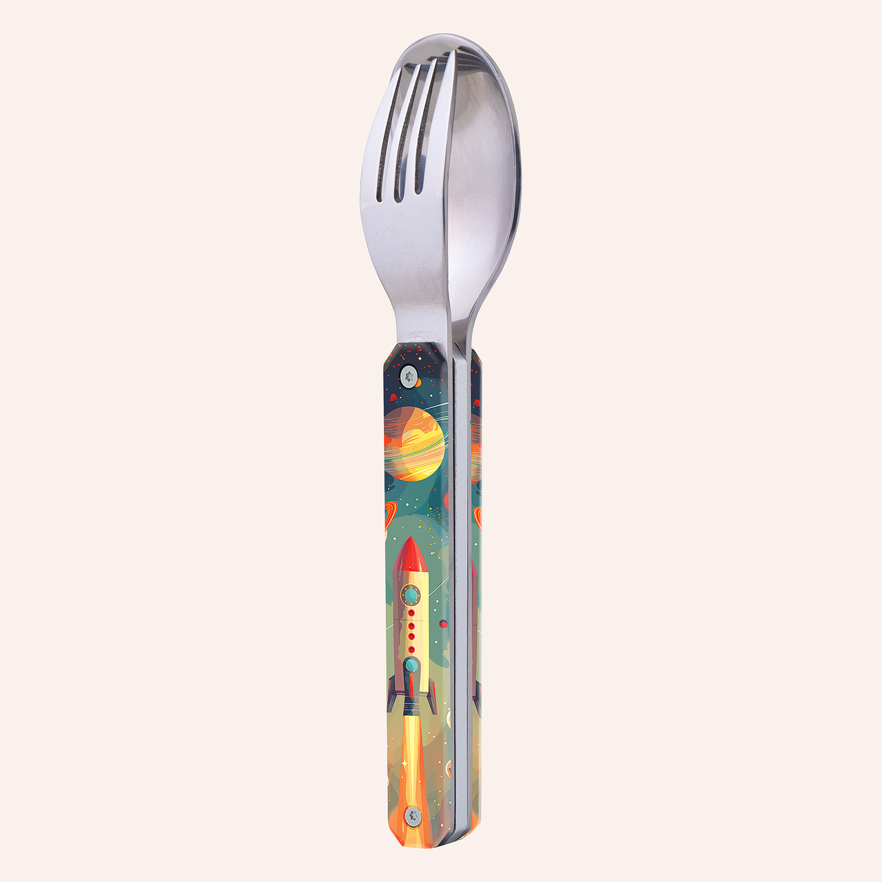 Besteck aus martensitischem Edelstahl 2CR14, hochglanzpoliert. Bestehend aus einem Löffel und einer 4-zahnigen Gabel. Dekorierter, transparenter Polymer (PC)-Griff. Fixierung mittels verbautem Magnet. Geliefert mit einem Trageetui aus Hartpolypropylen (PP). Spülmaschinenfest.
