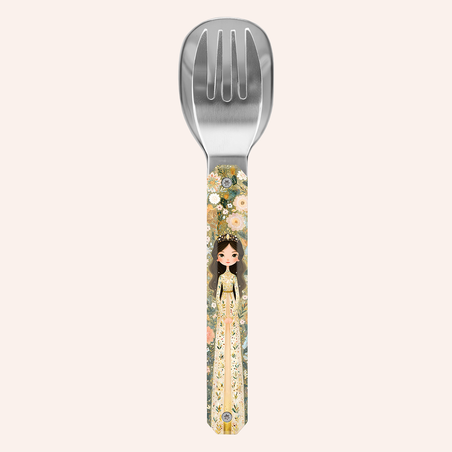Besteck aus martensitischem Edelstahl 2CR14, hochglanzpoliert. Bestehend aus einem Löffel und einer 4-zahnigen Gabel. Dekorierter, transparenter Polymer (PC)-Griff. Fixierung mittels verbautem Magnet. Geliefert mit einem Trageetui aus Hartpolypropylen (PP). Spülmaschinenfest.