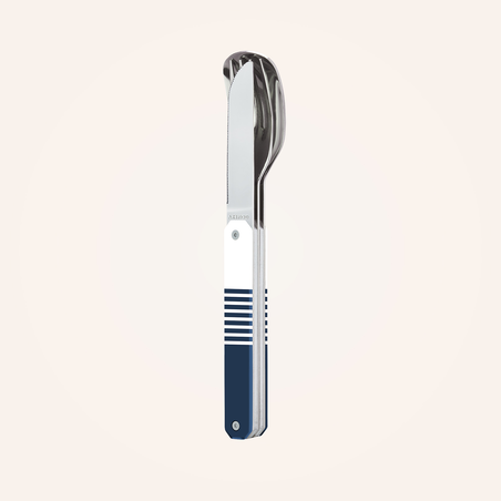 Besteck aus martensitischem Edelstahl 2CR14, hochglanzpoliert. Bestehend aus einem großen Löffel, einer 4-zahnigen Gabel und einem Messer mit einer mikroverzahnten Klinge. Dekorierter, transparenter Polymer (PC)-Griff. Fixierung mittels verbautem Magnet. Geliefert mit einem Trageetui aus Hartpolypropylen (PP). Spülmaschinenfest.