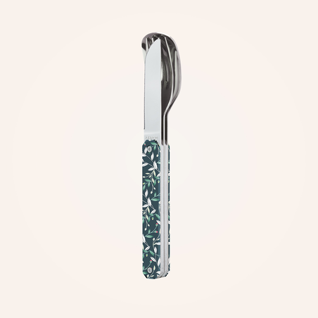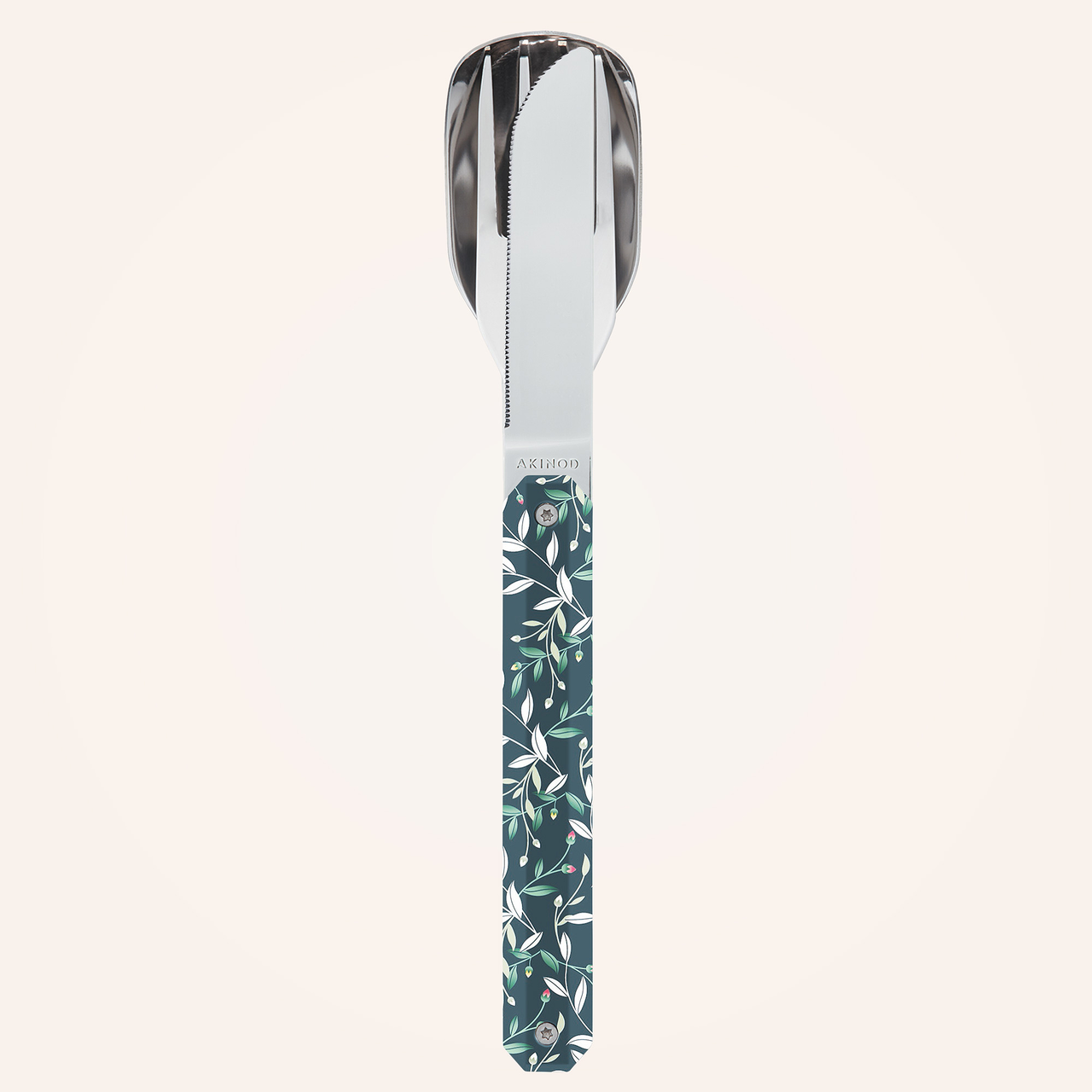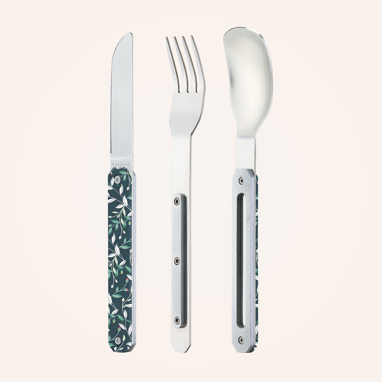Besteck aus martensitischem Edelstahl 2CR14, hochglanzpoliert. Bestehend aus einem großen Löffel, einer 4-zahnigen Gabel und einem Messer mit einer mikroverzahnten Klinge. Dekorierter, transparenter Polymer (PC)-Griff. Fixierung mittels verbautem Magnet. Geliefert mit einem Trageetui aus Hartpolypropylen (PP). Spülmaschinenfest.
