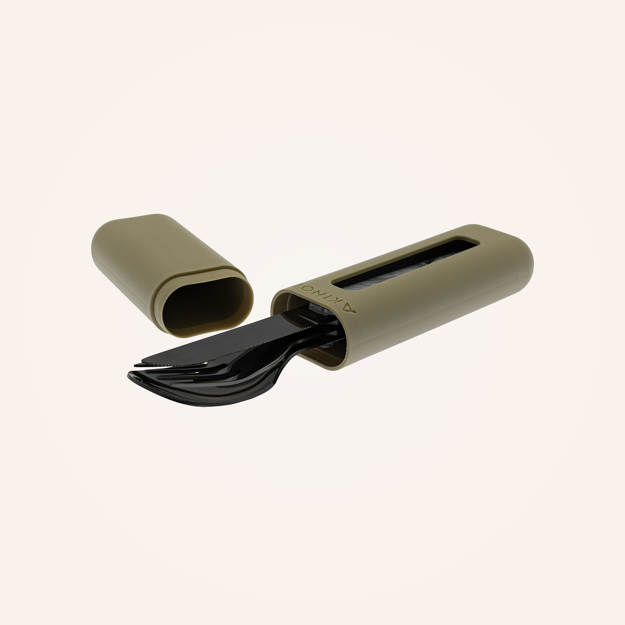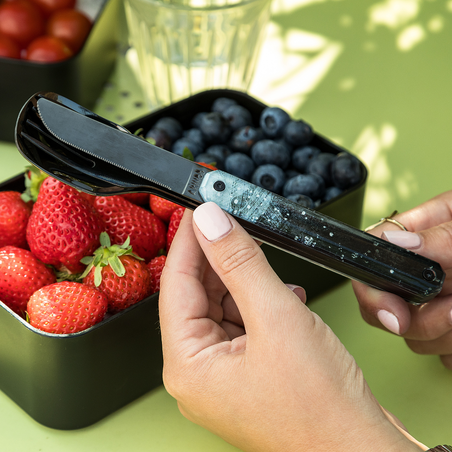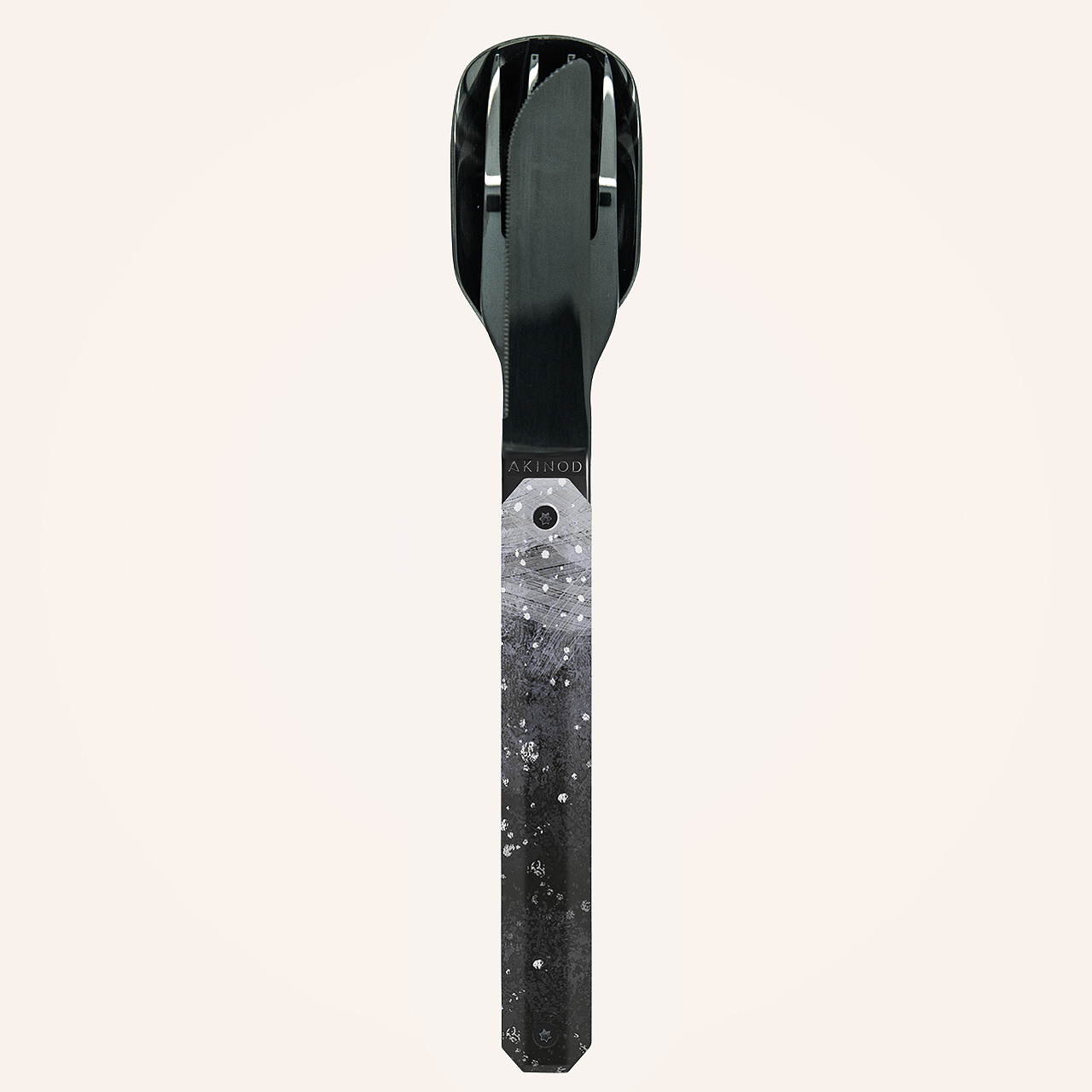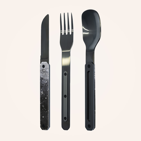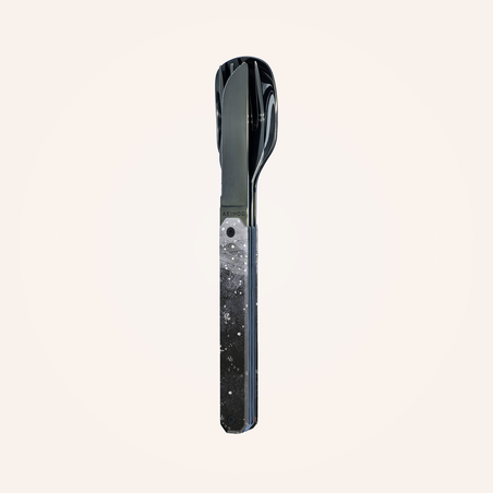 Besteck aus martensitischem Edelstahl 2CR14, hochglanz schwarz. Bestehend aus einem großen Löffel, einer 4-zahnigen Gabel und einem Messer mit einer mikroverzahnten Klinge. Dekorierter, transparenter Polymer (PC)-Griff. Fixierung mittels verbautem Magnet. Geliefert mit einem Trageetui aus Hartpolypropylen (PP). Spülmaschinenfest.