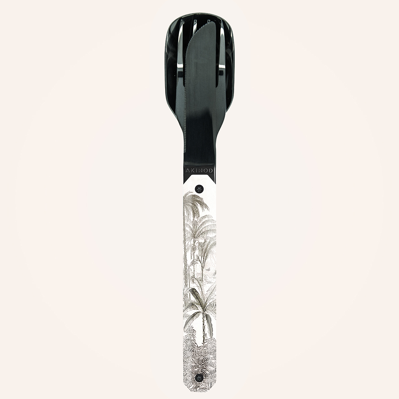 Besteck aus martensitischem Edelstahl 2CR14, hochglanz schwarz. Bestehend aus einem großen Löffel, einer 4-zahnigen Gabel und einem Messer mit einer mikroverzahnten Klinge. Dekorierter, transparenter Polymer (PC)-Griff. Fixierung mittels verbautem Magnet. Geliefert mit einem Trageetui aus Hartpolypropylen (PP). Spülmaschinenfest.