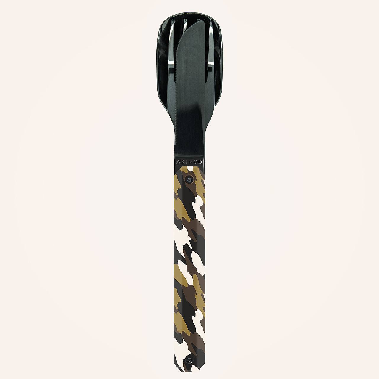 Besteck aus martensitischem Edelstahl 2CR14, hochglanz schwarz. Bestehend aus einem großen Löffel, einer 4-zahnigen Gabel und einem Messer mit einer mikroverzahnten Klinge. Dekorierter, transparenter Polymer (PC)-Griff. Fixierung mittels verbautem Magnet. Geliefert mit einem Trageetui aus Hartpolypropylen (PP). Spülmaschinenfest.