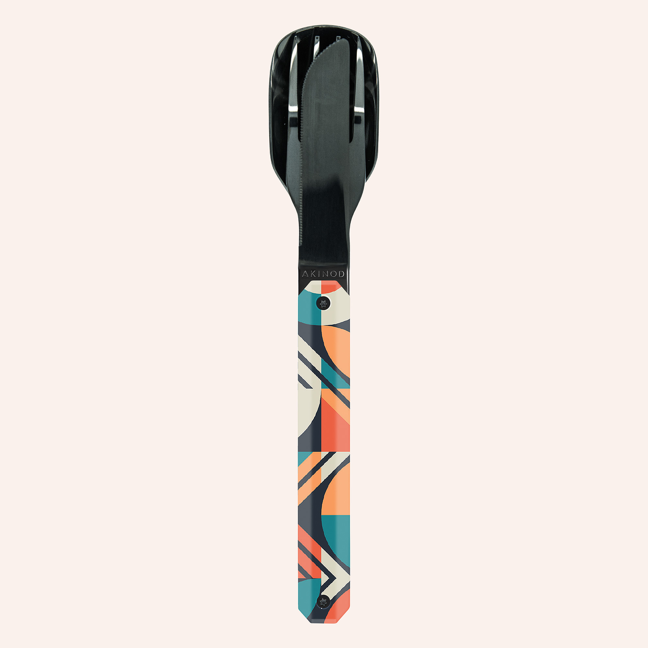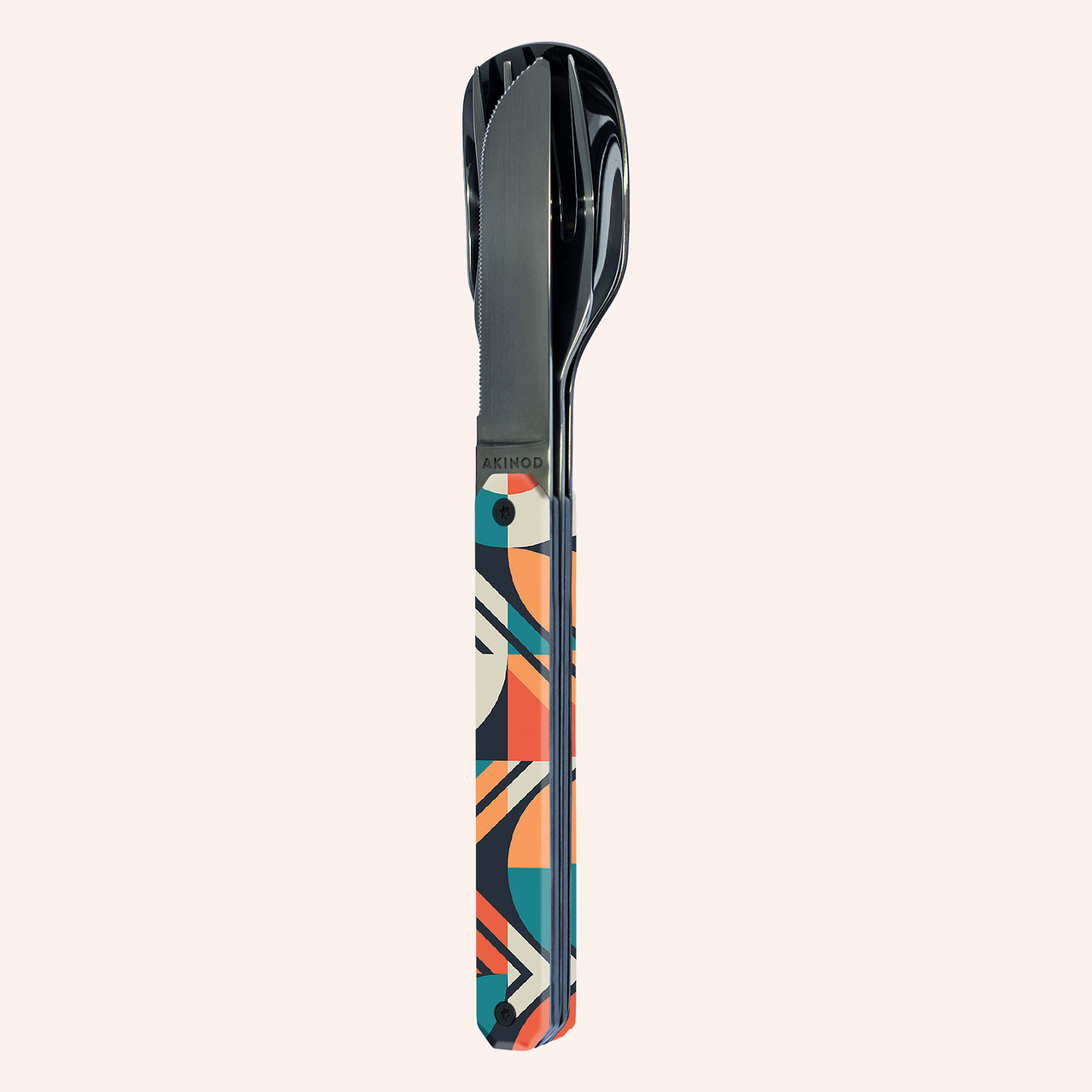 Besteck aus martensitischem Edelstahl 2CR14, hochglanz schwarz. Bestehend aus einem großen Löffel, einer 4-zahnigen Gabel und einem Messer mit einer mikroverzahnten Klinge. Dekorierter, transparenter Polymer (PC)-Griff. Fixierung mittels verbautem Magnet. Geliefert mit einem Trageetui aus Hartpolypropylen (PP). Spülmaschinenfest.