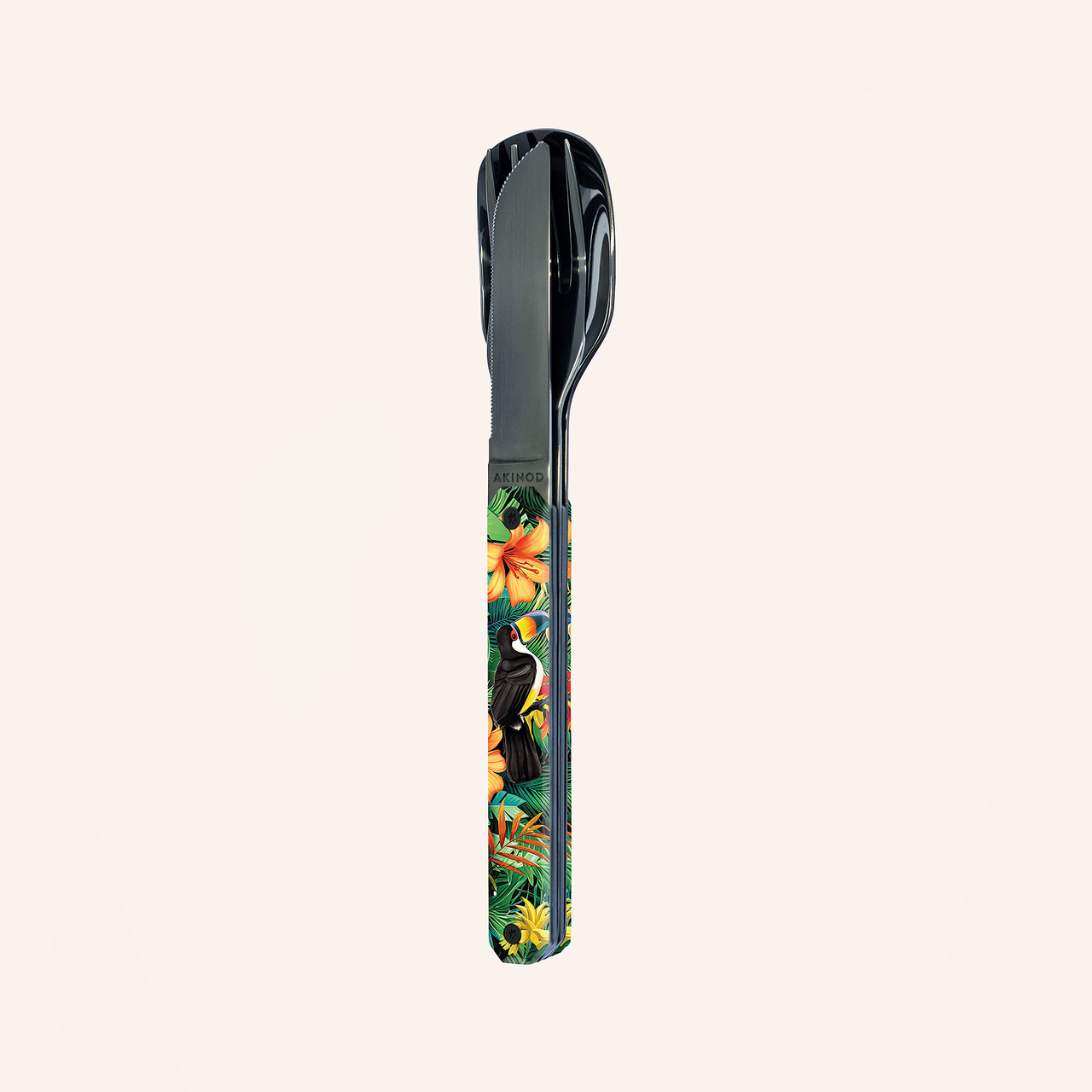 Besteck aus martensitischem Edelstahl 2CR14, hochglanz schwarz. Bestehend aus einem großen Löffel, einer 4-zahnigen Gabel und einem Messer mit einer mikroverzahnten Klinge. Dekorierter, transparenter Polymer (PC)-Griff. Fixierung mittels verbautem Magnet. Geliefert mit einem Trageetui aus Hartpolypropylen (PP). Spülmaschinenfest.