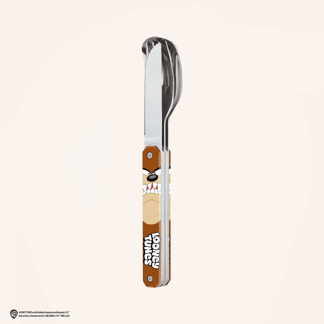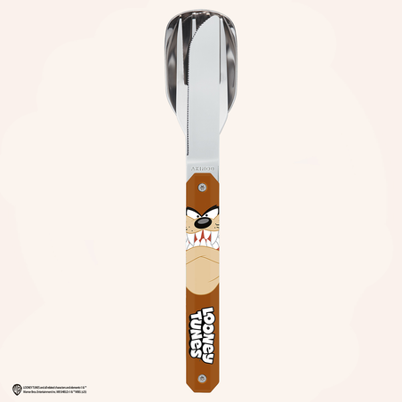 Besteck aus martensitischem Edelstahl 2CR14, hochglanzpoliert. Bestehend aus einem großen Löffel, einer 4-zahnigen Gabel und einem Messer mit einer mikroverzahnten Klinge. Dekorierter, transparenter Polymer (PC)-Griff. Fixierung mittels verbautem Magnet. Spüllmaschinenfest.