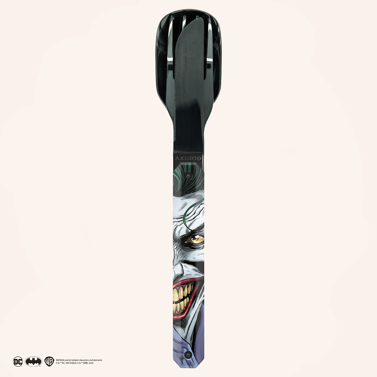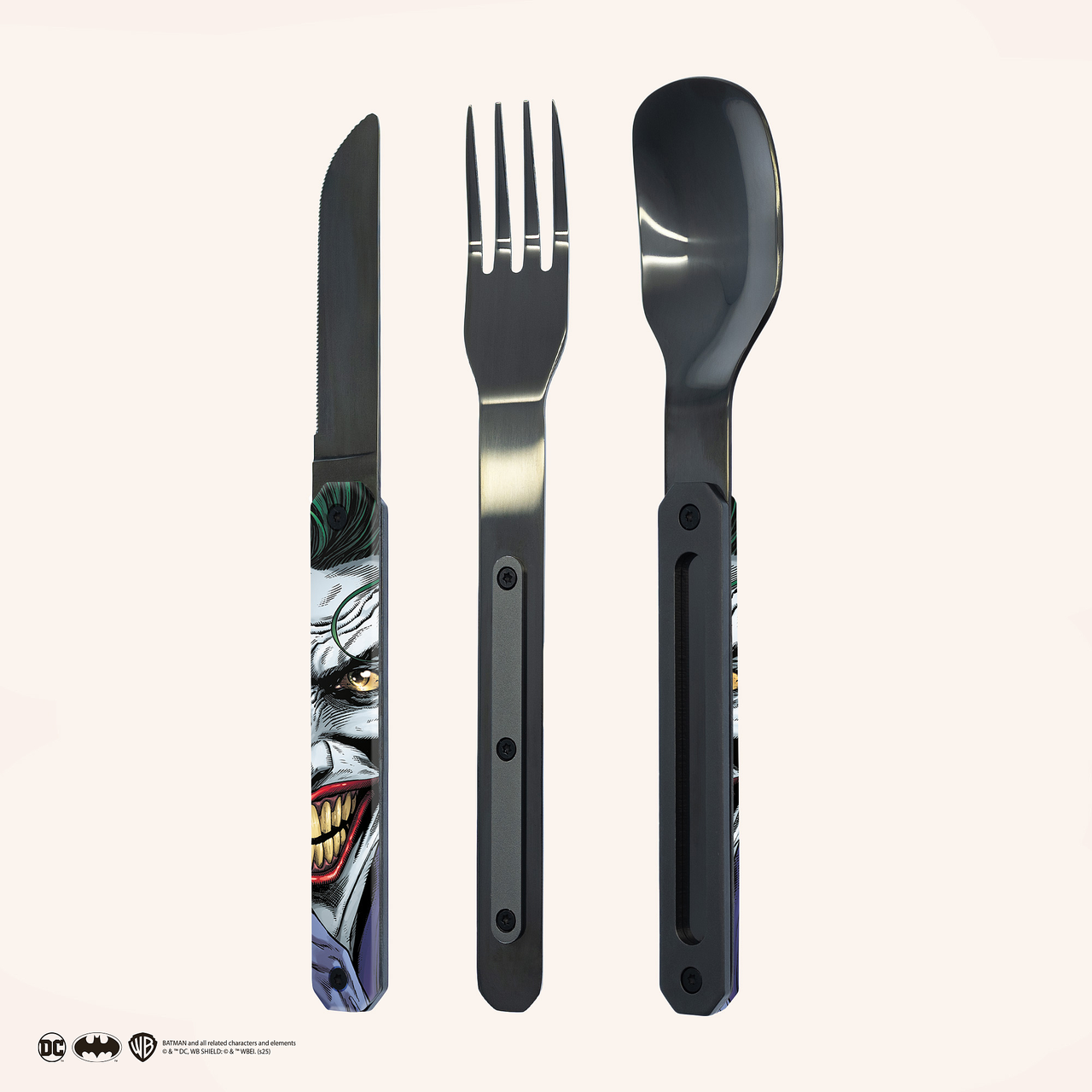 Besteck aus martensitischem Edelstahl 2CR14, hochglanz schwarz. Bestehend aus einem großen Löffel, einer 4-zahnigen Gabel und einem Messer mit einer mikroverzahnten Klinge. Dekorierter, transparenter Polymer (PC)-Griff. Fixierung mittels verbautem Magnet. Geliefert mit einem Trageetui aus Hartpolypropylen (PP). Spülmaschinenfest.