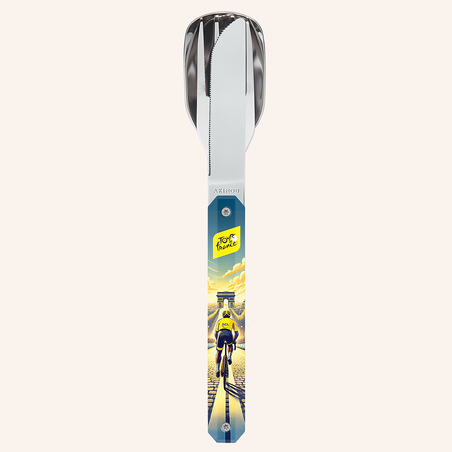 Besteck aus martensitischem Edelstahl 2CR14, hochglanzpoliert. Bestehend aus einem großen Löffel, einer 4-zahnigen Gabel und einem Messer mit einer mikroverzahnten Klinge. Dekorierter, transparenter Polymer (PC)-Griff. Fixierung mittels verbautem Magnet.