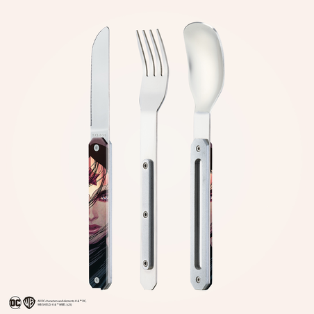 Besteck aus martensitischem Edelstahl 2CR14, hochglanzpoliert. Bestehend aus einem großen Löffel, einer 4-zahnigen Gabel und einem Messer mit einer mikroverzahnten Klinge. Dekorierter, transparenter Polymer (PC)-Griff. Fixierung mittels verbautem Magnet. Spüllmaschinenfest.