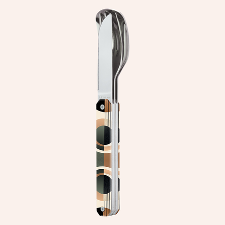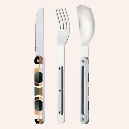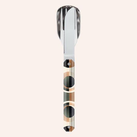 Besteck aus martensitischem Edelstahl 2CR14, hochglanzpoliert. Bestehend aus einem großen Löffel, einer 4-zahnigen Gabel und einem Messer mit einer mikroverzahnten Klinge. Dekorierter, transparenter Polymer (PC)-Griff. Fixierung mittels verbautem Magnet.