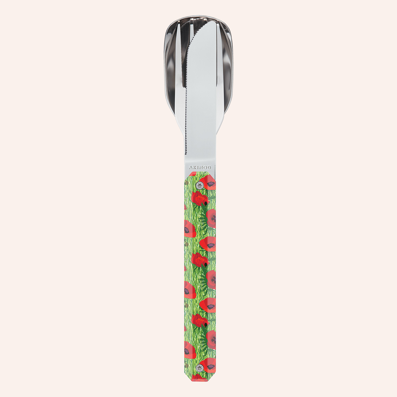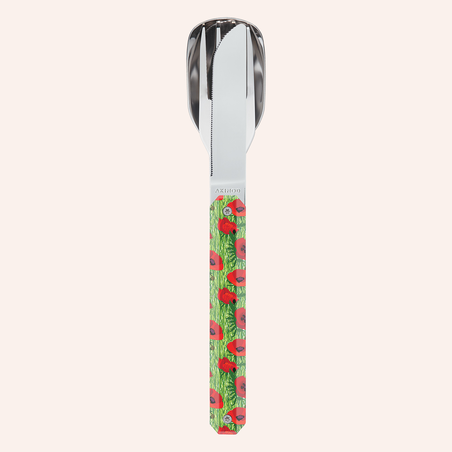 Besteck aus martensitischem Edelstahl 2CR14, hochglanzpoliert. Bestehend aus einem großen Löffel, einer 4-zahnigen Gabel und einem Messer mit einer mikroverzahnten Klinge. Dekorierter, transparenter Polymer (PC)-Griff. Fixierung mittels verbautem Magnet.