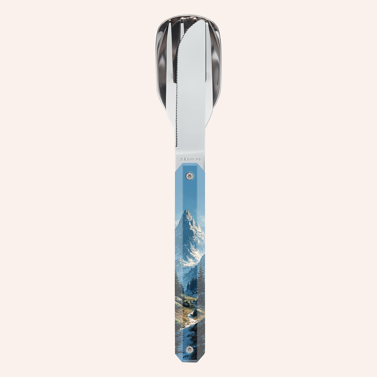 Besteck aus martensitischem Edelstahl 2CR14, hochglanzpoliert. Bestehend aus einem großen Löffel, einer 4-zahnigen Gabel und einem Messer mit einer mikroverzahnten Klinge. Dekorierter, transparenter Polymer (PC)-Griff. Fixierung mittels verbautem Magnet.