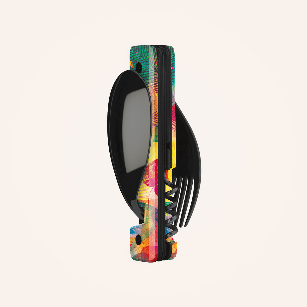 Multifunktionales Besteck aus martensitischem Edelstahl 2CR14, hochglanz schwarz. Bestehend aus einem großen Löffel, einer 5-zahnigen Gabel, einem Messer mit einer mikroverzahnten Klinge, einem Korkenzieher mit 4 Spiralen, einem Dosenöffner und einem Flaschenöffner. Griffbeschlag aus transparentem, dekoriertem Polymer (PC). Fixierung mittels verbautem Magnet. Geliefert mit einem Trageetui aus Hartpolypropylen (PP).