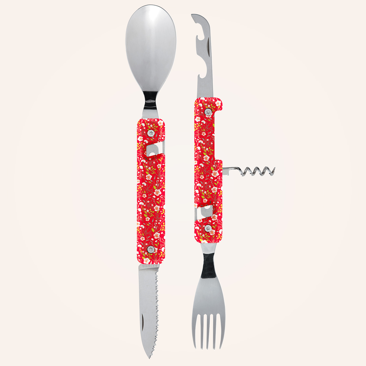 Multifunktionales Besteck aus martensitischem Edelstahl 2CR14, hochglanzpoliert. Bestehend aus einem großen Löffel, einer 5-zahnigen Gabel, einem Messer mit einer mikroverzahnten Klinge, einem Korkenzieher mit 4 Spiralen, einem Dosenöffner und einem Flaschenöffner. Griffbeschlag aus transparentem, dekoriertem Polymer (PC). Fixierung mittels verbautem Magnet. Geliefert mit einem Trageetui aus Hartpolypropylen (PP).
