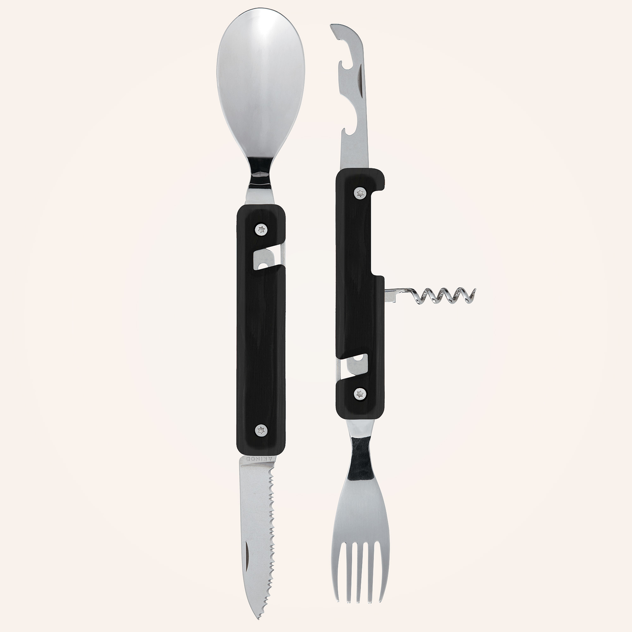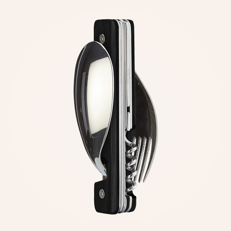 Multifunktionales Besteck aus martensitischem Edelstahl 2CR14, hochglanzpoliert. Bestehend aus einem großen Löffel, einer 5-zahnigen Gabel, einem Messer mit einer mikroverzahnten Klinge, einem Korkenzieher mit 4 Spiralen, einem Dosenöffner und einem Flaschenöffner. Griff aus Ebenholz. Fixierung mittels verbautem Magnet. Geliefert mit einem Trageetui aus Hartpolypropylen (PP).