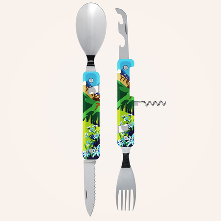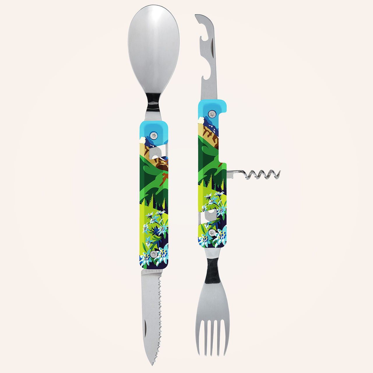 Multifunktionales Besteck aus martensitischem Edelstahl 2CR14, hochglanzpoliert. Bestehend aus einem großen Löffel, einer 5-zahnigen Gabel, einem Messer mit einer mikroverzahnten Klinge, einem Korkenzieher mit 4 Spiralen, einem Dosenöffner und einem Flaschenöffner. Griffbeschlag aus transparentem, dekoriertem Polymer (PC). Fixierung mittels verbautem Magnet. Geliefert mit einem Trageetui aus Hartpolypropylen (PP).