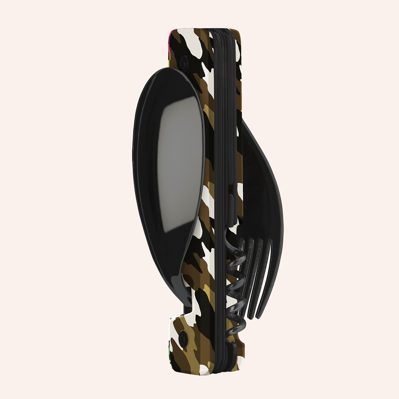 Multifunktionales Besteck aus martensitischem Edelstahl 2CR14, hochglanz schwarz. Bestehend aus einem großen Löffel, einer 5-zahnigen Gabel, einem Messer mit einer mikroverzahnten Klinge, einem Korkenzieher mit 4 Spiralen, einem Dosenöffner und einem Flaschenöffner. Griffbeschlag aus transparentem, dekoriertem Polymer (PC). Fixierung mittels verbautem Magnet. Geliefert mit einem Trageetui aus Hartpolypropylen (PP).