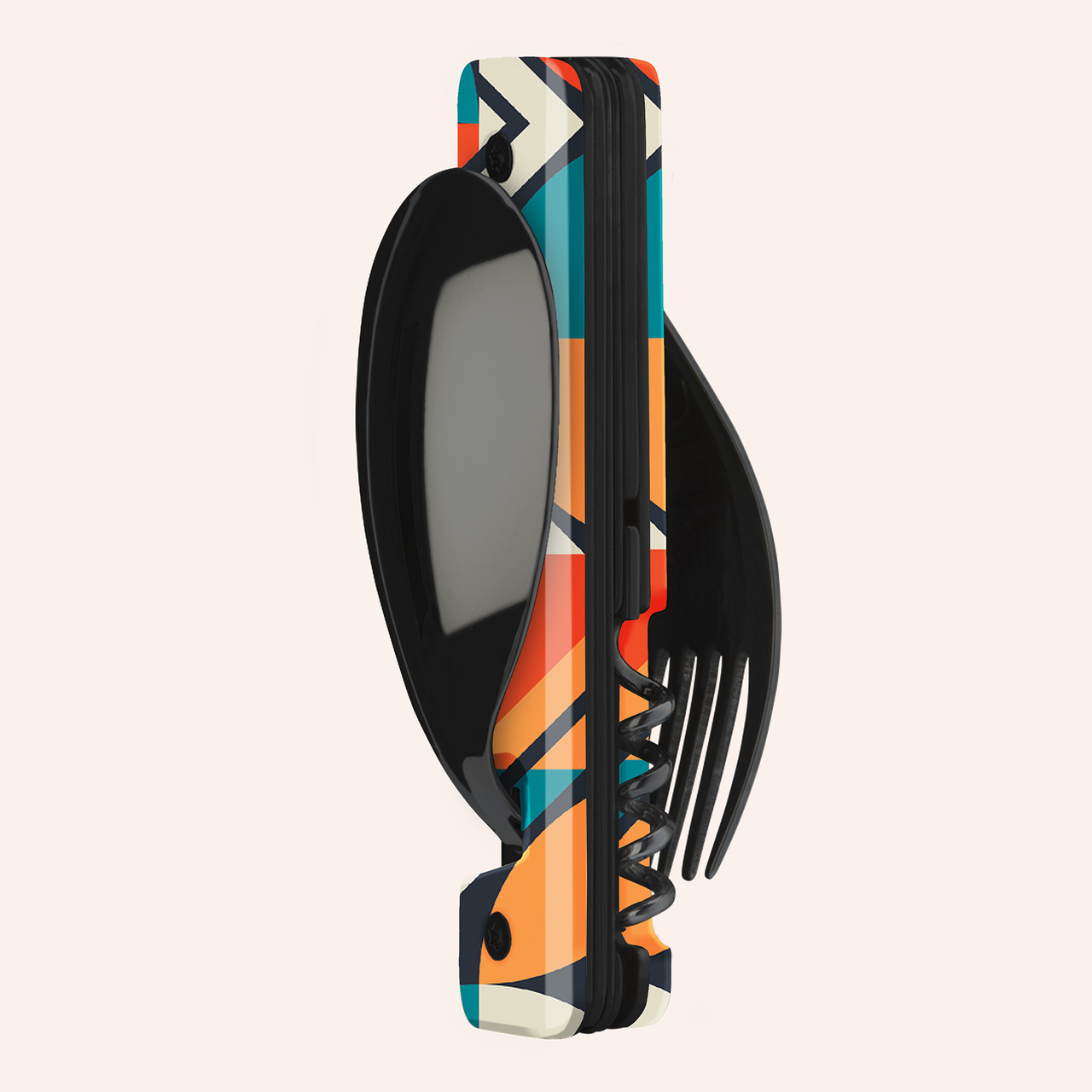 Multifunktionales Besteck aus martensitischem Edelstahl 2CR14, hochglanz schwarz. Bestehend aus einem großen Löffel, einer 5-zahnigen Gabel, einem Messer mit einer mikroverzahnten Klinge, einem Korkenzieher mit 4 Spiralen, einem Dosenöffner und einem Flaschenöffner. Griffbeschlag aus transparentem, dekoriertem Polymer (PC). Fixierung mittels verbautem Magnet. Geliefert mit einem Trageetui aus Hartpolypropylen (PP).