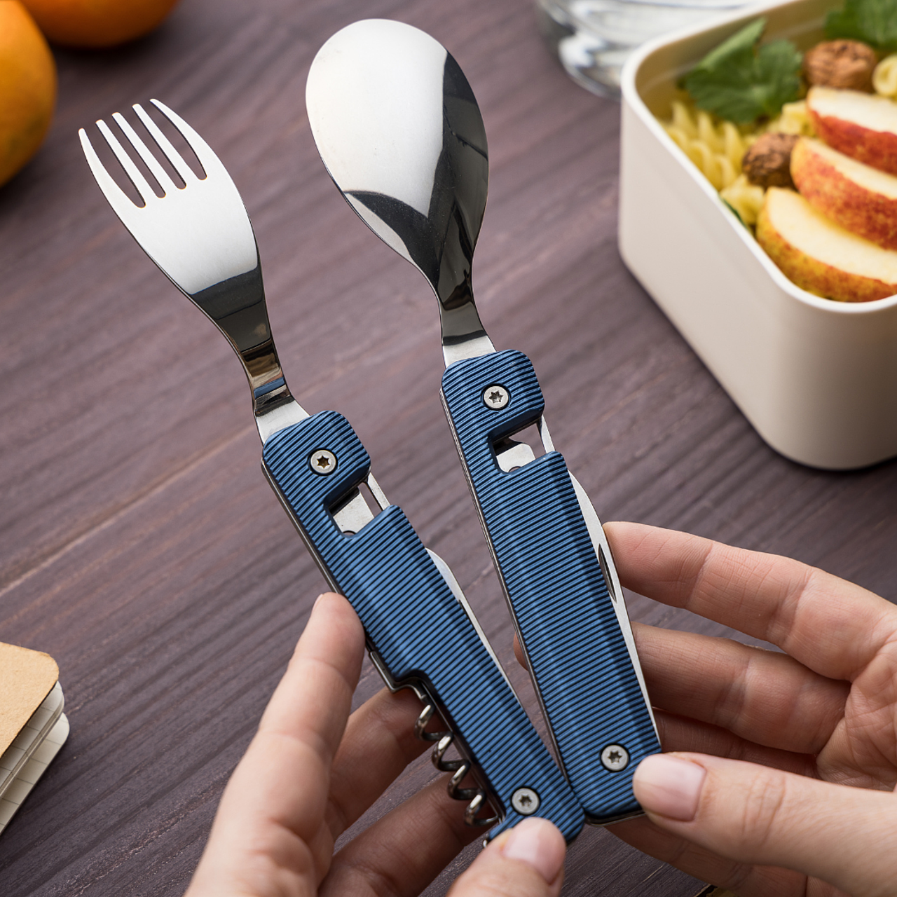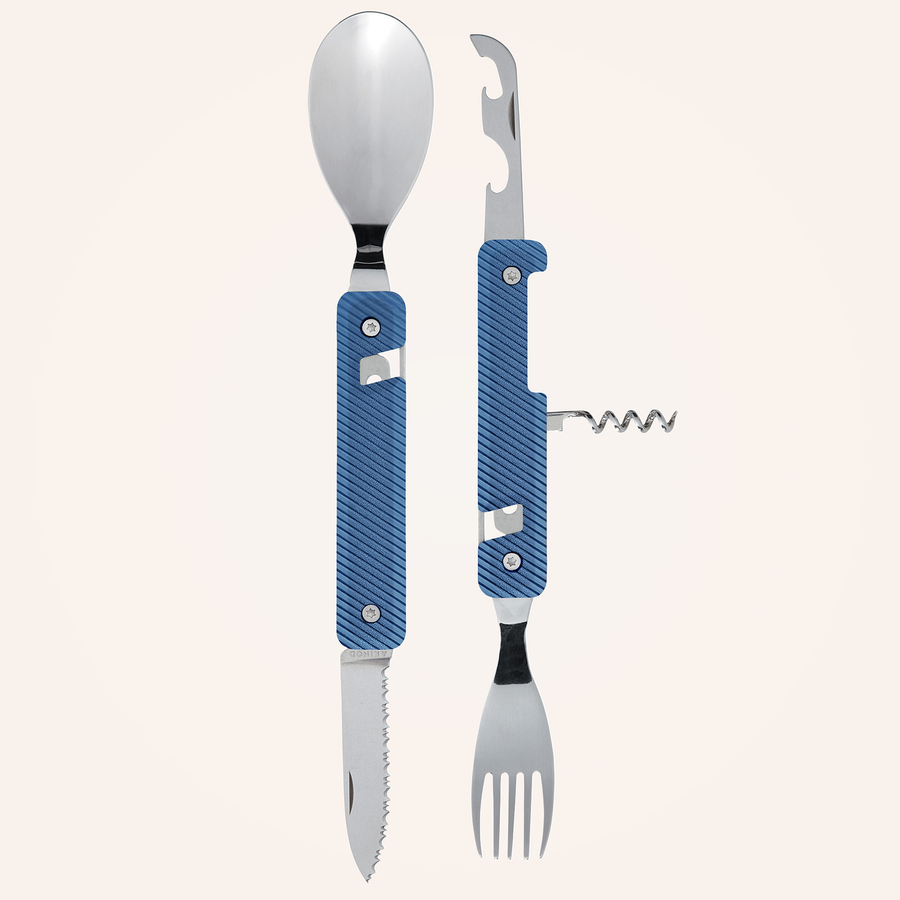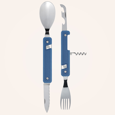 Multifunktionales Besteck aus martensitischem Edelstahl 2CR14, hochglanzpoliert. Bestehend aus einem großen Löffel, einer 5-zahnigen Gabel, einem Messer mit einer mikroverzahnten Klinge, einem Korkenzieher mit 4 Spiralen, einem Dosenöffner und einem Flaschenöffner. Griff aus Aluminium. Fixierung mittels verbautem Magnet. Geliefert mit einem Trageetui aus Hartpolypropylen (PP).