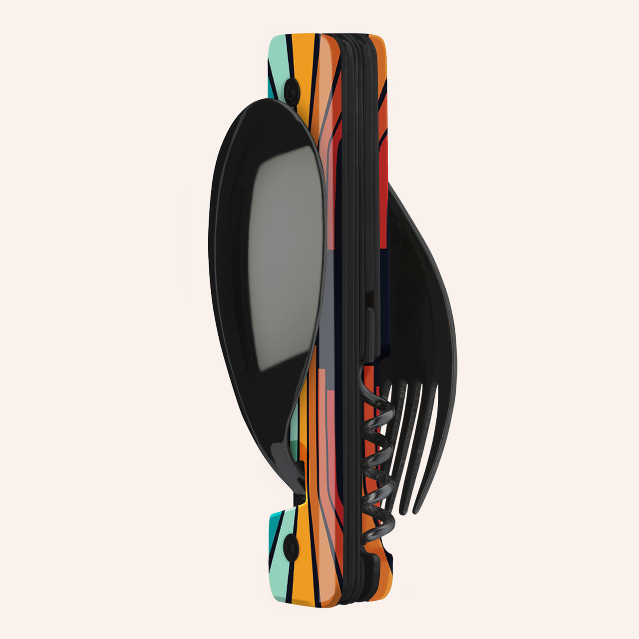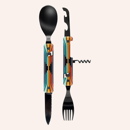 Multifunktionales Besteck aus martensitischem Edelstahl 2CR14, hochglanz schwarz. Bestehend aus einem großen Löffel, einer 5-zahnigen Gabel, einem Messer mit einer mikroverzahnten Klinge, einem Korkenzieher mit 4 Spiralen, einem Dosenöffner und einem Flaschenöffner. Griffbeschlag aus transparentem, dekoriertem Polymer (PC). Fixierung mittels verbautem Magnet. Geliefert mit einem Trageetui aus Hartpolypropylen (PP).