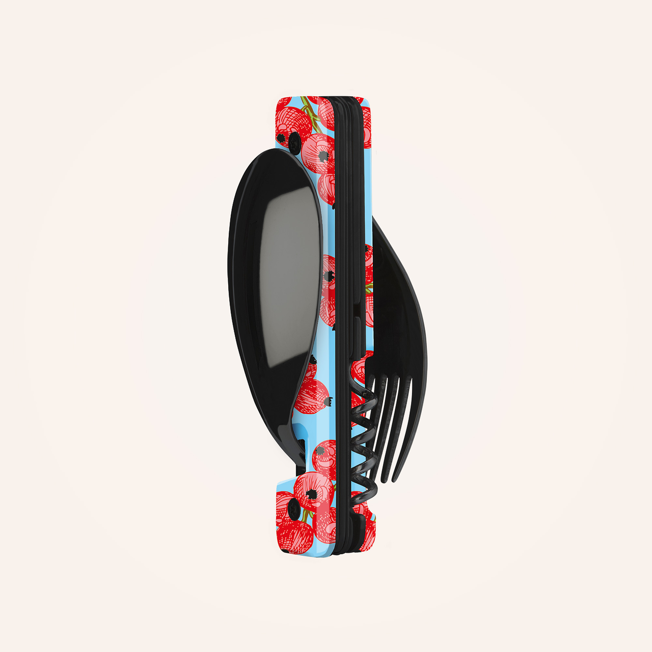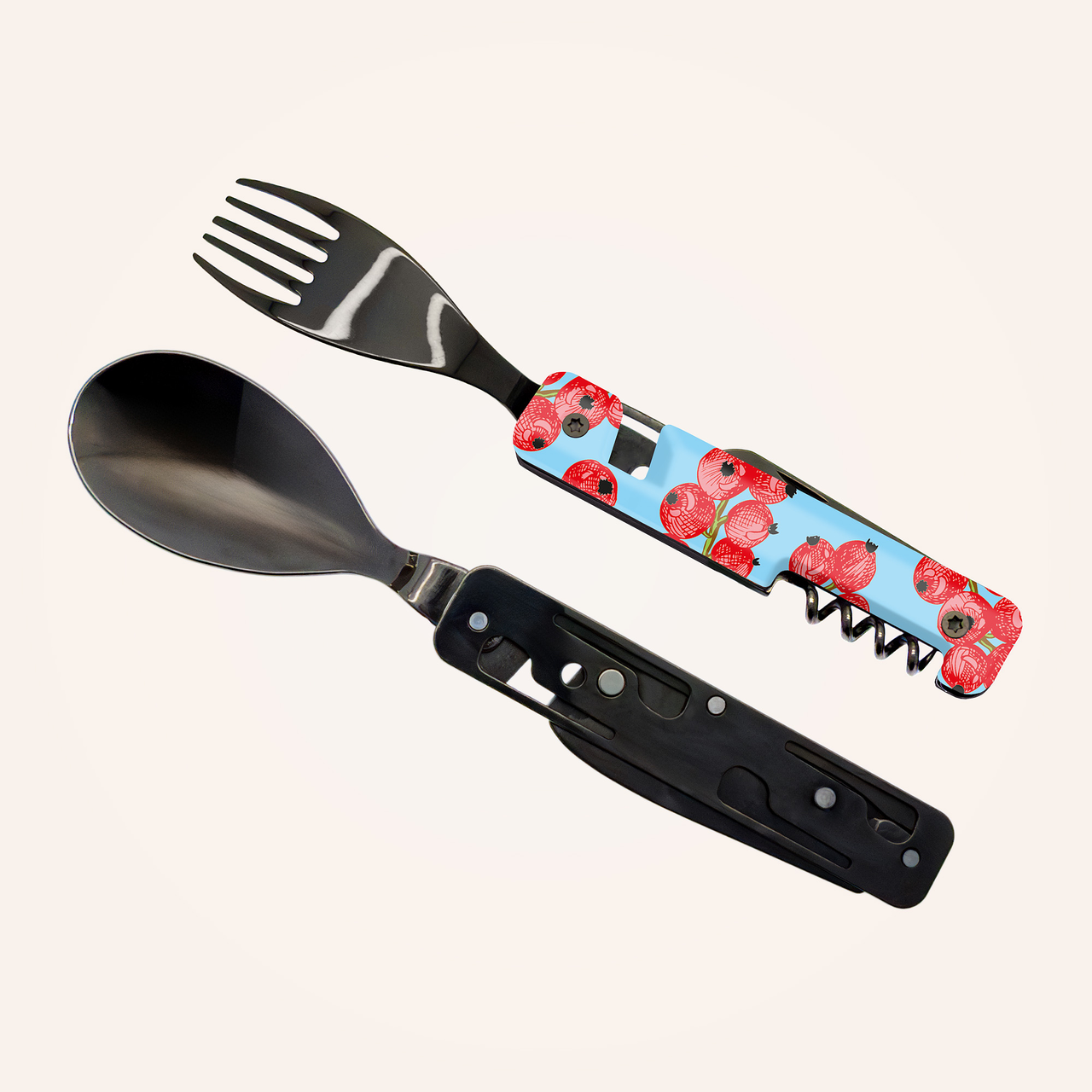 Multifunktionales Besteck aus martensitischem Edelstahl 2CR14, hochglanz schwarz. Bestehend aus einem großen Löffel, einer 5-zahnigen Gabel, einem Messer mit einer mikroverzahnten Klinge, einem Korkenzieher mit 4 Spiralen, einem Dosenöffner und einem Flaschenöffner. Griffbeschlag aus transparentem, dekoriertem Polymer (PC). Fixierung mittels verbautem Magnet. Geliefert mit einem Trageetui aus Hartpolypropylen (PP).