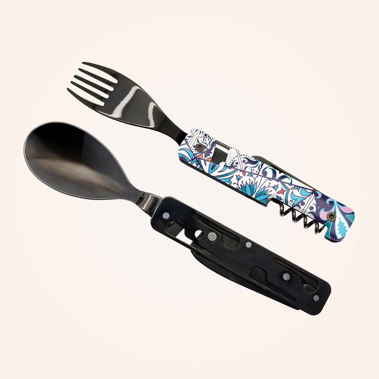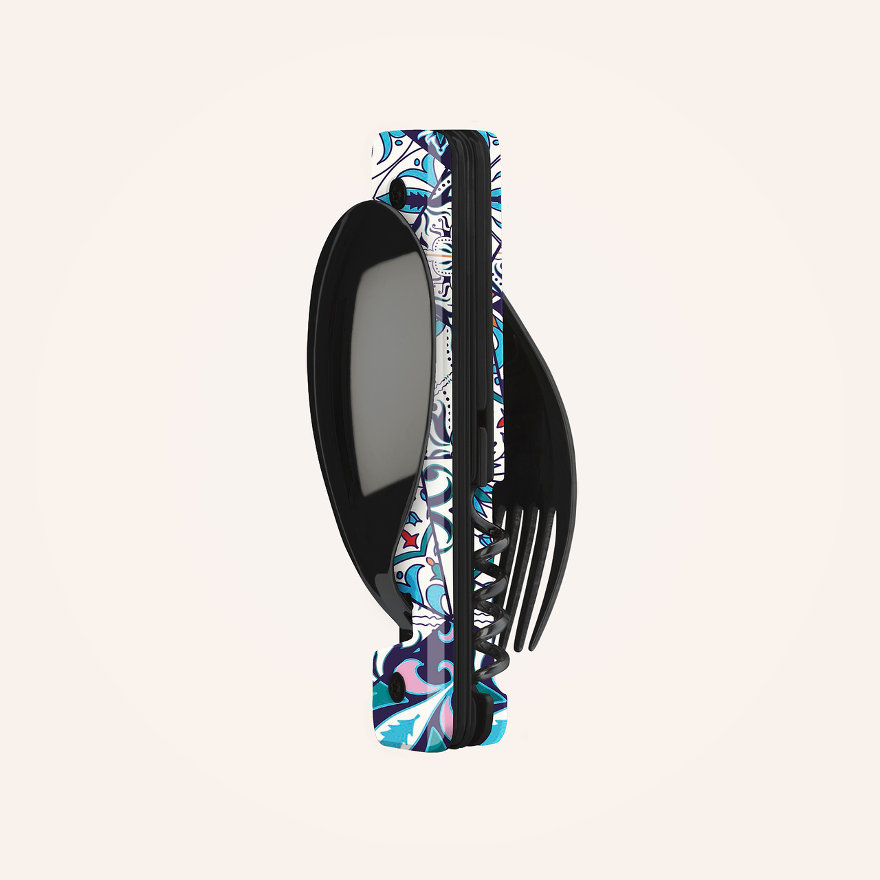 Multifunktionales Besteck aus martensitischem Edelstahl 2CR14, hochglanz schwarz. Bestehend aus einem großen Löffel, einer 5-zahnigen Gabel, einem Messer mit einer mikroverzahnten Klinge, einem Korkenzieher mit 4 Spiralen, einem Dosenöffner und einem Flaschenöffner. Griffbeschlag aus transparentem, dekoriertem Polymer (PC). Fixierung mittels verbautem Magnet. Geliefert mit einem Trageetui aus Hartpolypropylen (PP).