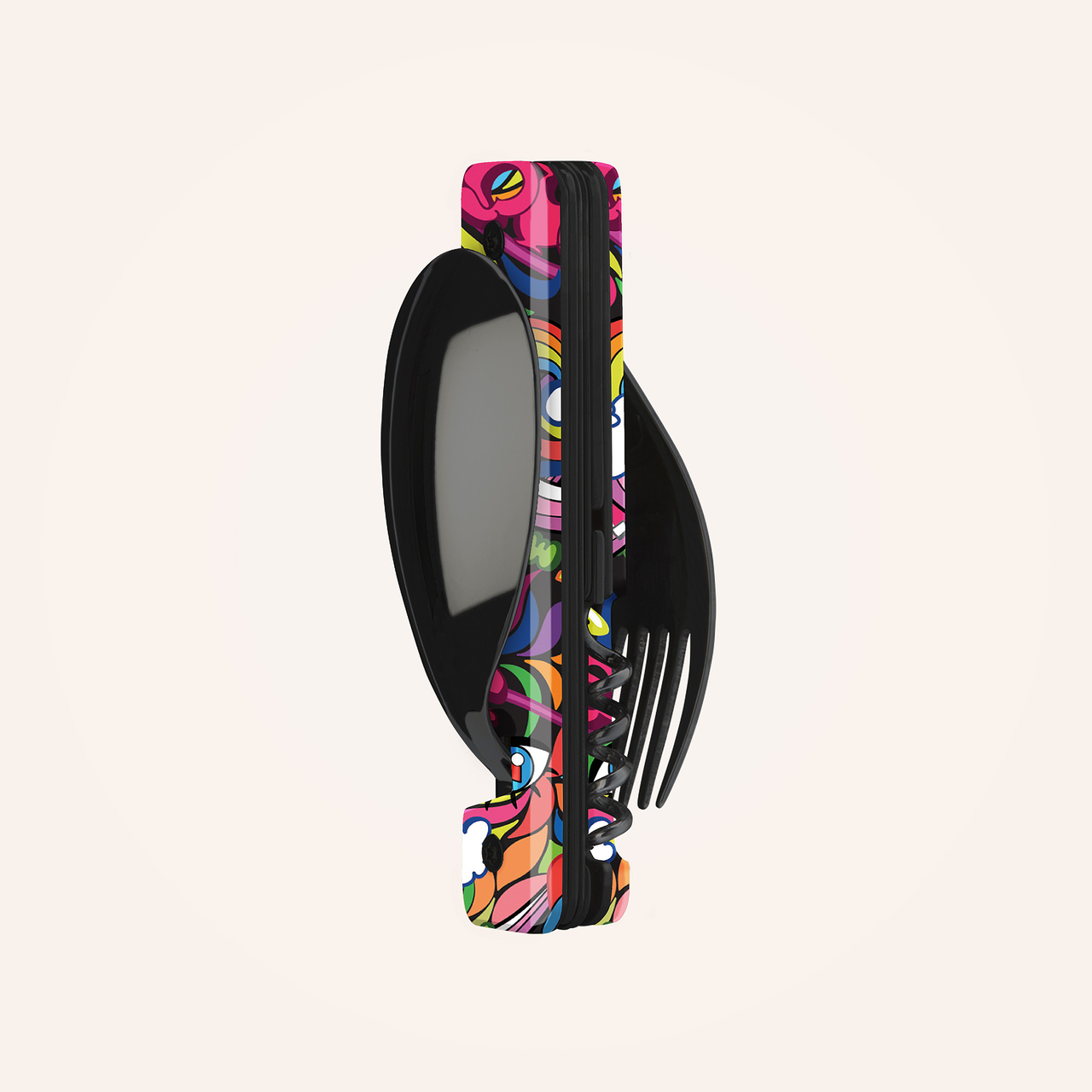 Multifunktionales Besteck aus martensitischem Edelstahl 2CR14, hochglanz schwarz. Bestehend aus einem großen Löffel, einer 5-zahnigen Gabel, einem Messer mit einer mikroverzahnten Klinge, einem Korkenzieher mit 4 Spiralen, einem Dosenöffner und einem Flaschenöffner. Griffbeschlag aus transparentem, dekoriertem Polymer (PC). Fixierung mittels verbautem Magnet. Geliefert mit einem Trageetui aus Hartpolypropylen (PP).