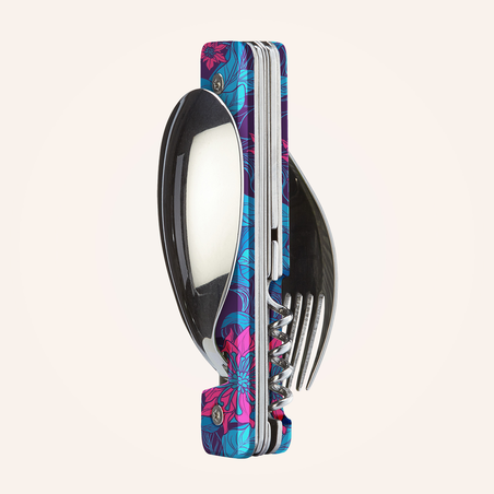 Multifunction cutlery in martensitic stainless steel 2CR14, polished mirror finish. Comprises a large spoon, a 5-pronged fork, a knife with a micro-serrated blade, a 4-spiral corkscrew, a can-opener and a bottle opener. Decorated transparent polymer (PC) handle. Magnetic assembly. Delivered with a rigid polypropylene (PP) carrying case.