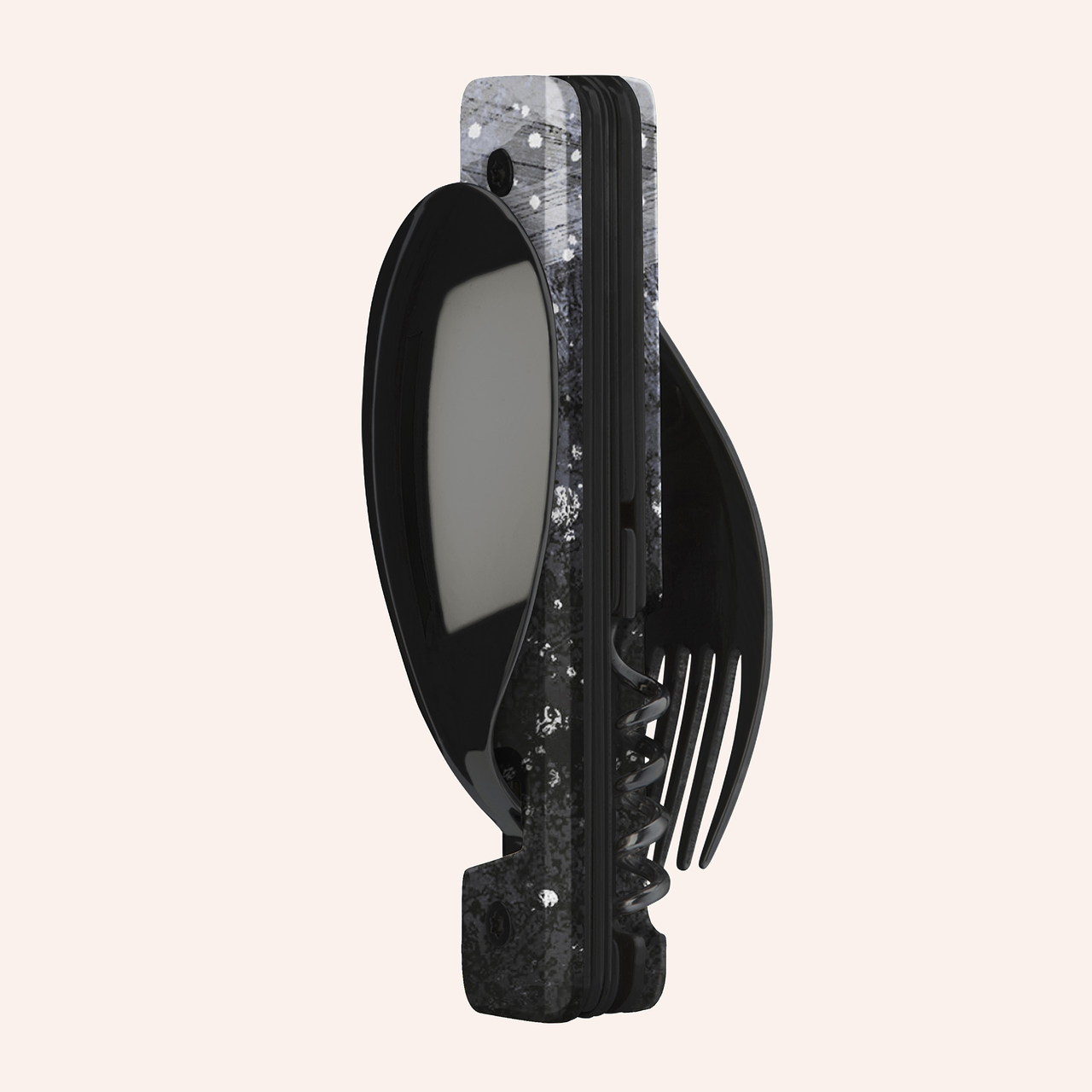 Multifunction cutlery in martensitic stainless steel 2CR14, polished black mirror finish. Comprises a large spoon, a 5-pronged fork, a knife with a micro-serrated blade, a 4-spiral corkscrew, a can-opener and a bottle opener. Decorated transparent polymer (PC) handle. Magnetic assembly. Delivered with a rigid polypropylene (PP) carrying case.