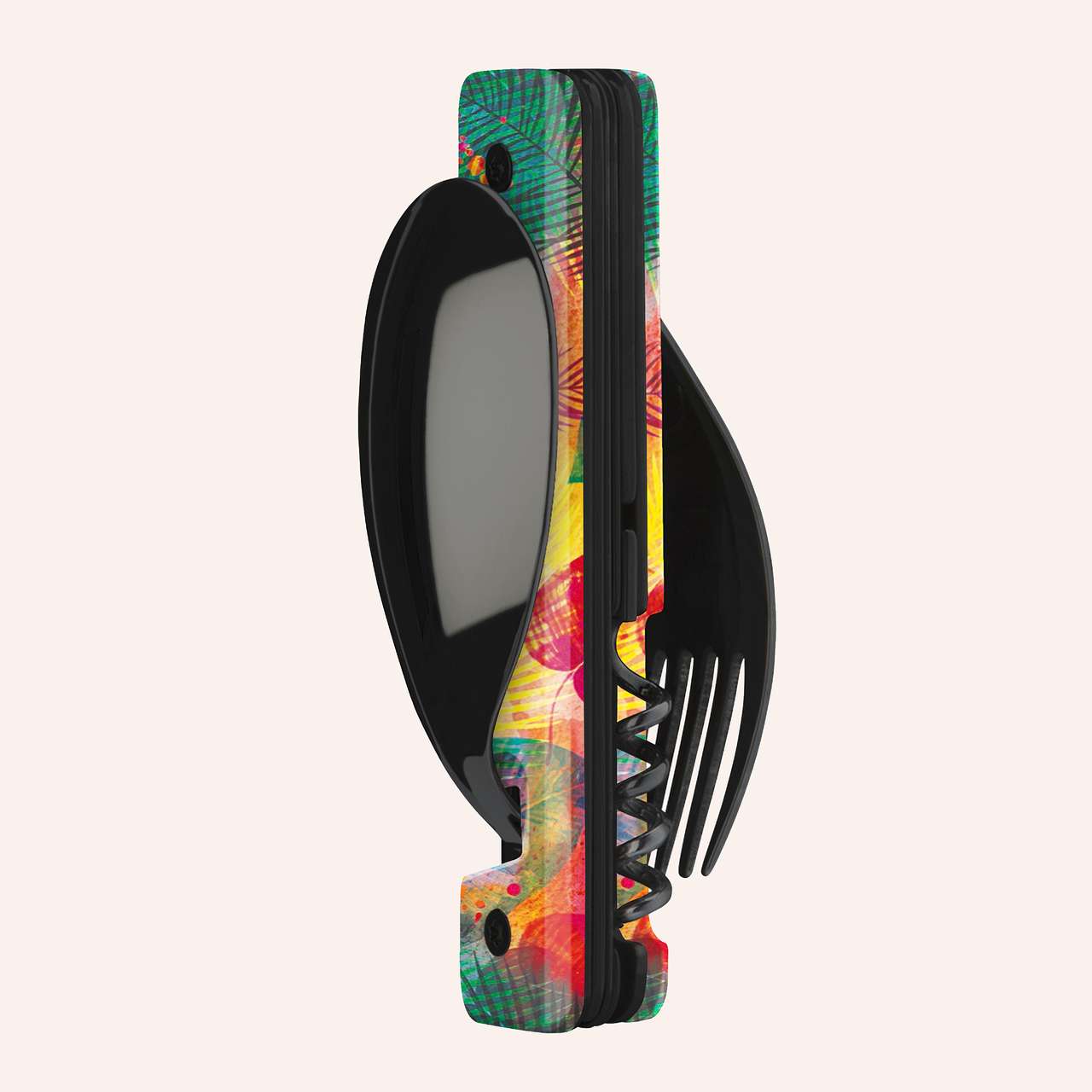 Multifunction cutlery in martensitic stainless steel 2CR14, polished black mirror finish. Comprises a large spoon, a 5-pronged fork, a knife with a micro-serrated blade, a 4-spiral corkscrew, a can-opener and a bottle opener. Decorated transparent polymer (PC) handle. Magnetic assembly. Delivered with a rigid polypropylene (PP) carrying case.