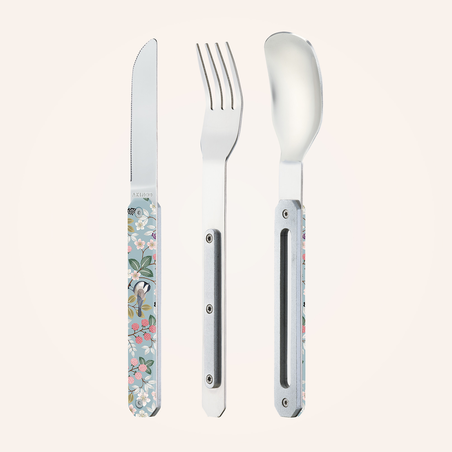 Cutlery in martensitic stainless steel 2CR14, polished mirror finish. Comprises a large spoon, a 4-pronged fork and a knife with a micro-serrated blade. Decorated transparent polymer handle. Magnetic assembly. Delivered with a rigid polypropylene (PP) carrying case. Dishwasher safe.