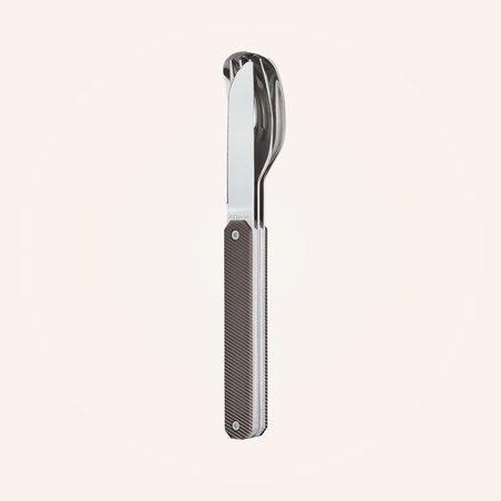 Cutlery in martensitic stainless steel 2CR14, polished mirror finish. Comprises a large spoon, a 4-pronged fork and a knife with a micro-serrated blade. Aluminium handle. Magnetic assembly. Delivered with a rigid polypropylene (PP) carrying case.