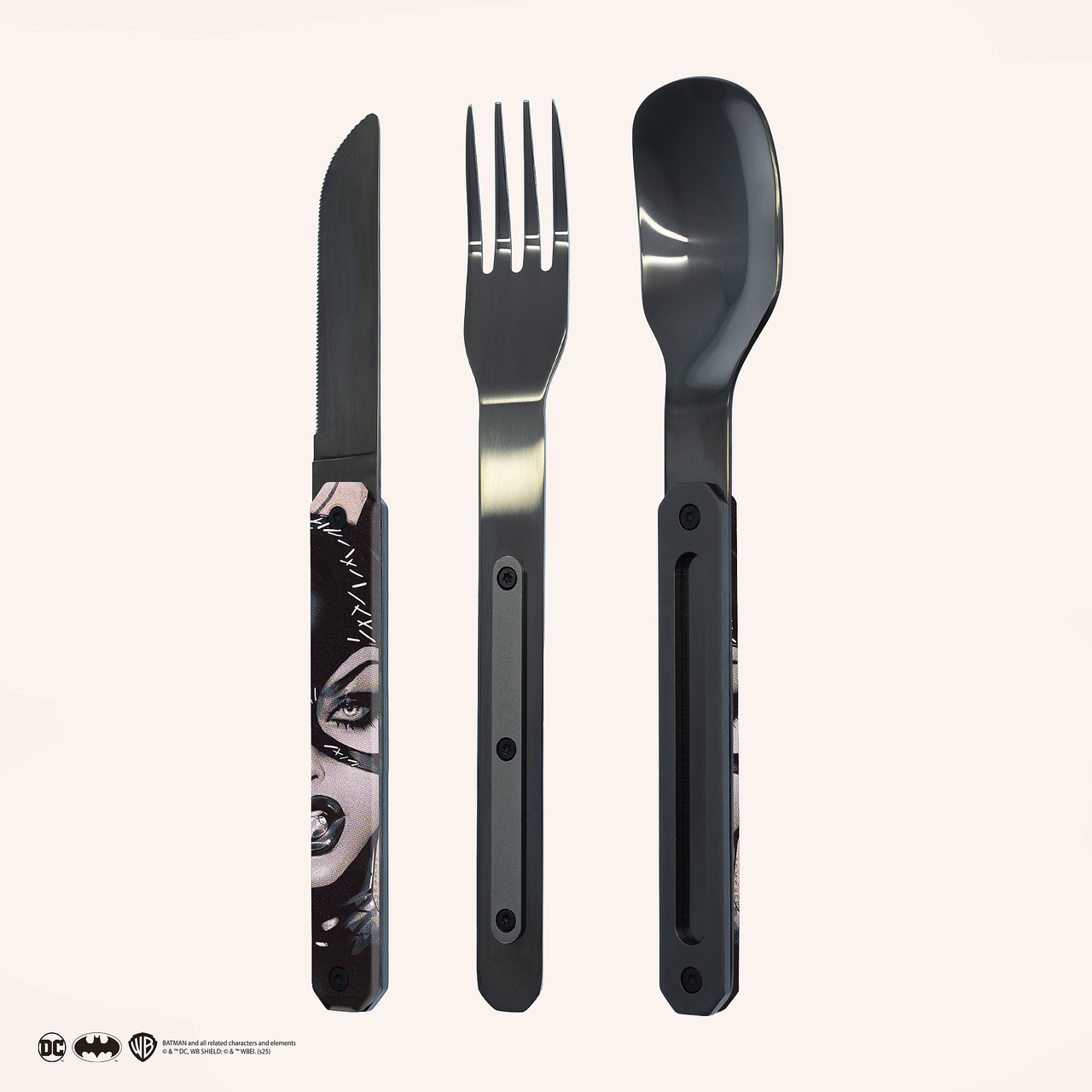 Cutlery in martensitic stainless steel 2CR14, black mirror finish. Comprises a large spoon, a 4-pronged fork and a knife with a micro-serrated blade. Decorated transparent polymer handle. Magnetic assembly. Delivered with a rigid polypropylene (PP) carrying case. Dishwasher safe.
