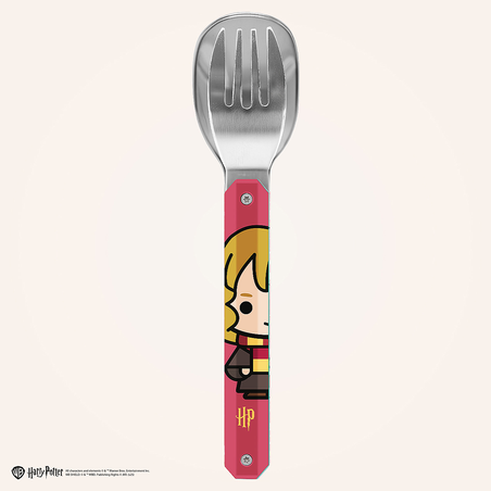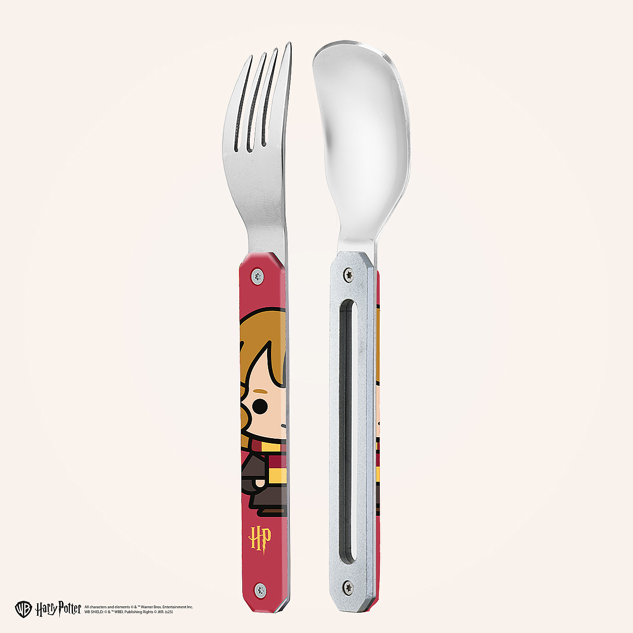 Couverts en acier inoxydable martensitique 2CR14,  finition poli miroir. Composé d’une cuillère et d’une fourchette 4 dents. Manche en polymère (PC) transparent décoré. Assemblage aimanté. Livré avec étui de transport en polypropylène rigide (PP). Compatible lave-vaisselle.