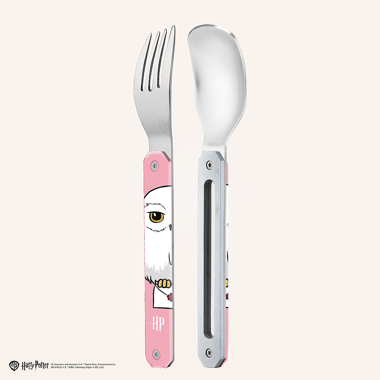 Couverts en acier inoxydable martensitique 2CR14,  finition poli miroir. Composé d’une cuillère et d’une fourchette 4 dents. Manche en polymère (PC) transparent décoré. Assemblage aimanté. Livré avec étui de transport en polypropylène rigide (PP). Compatible lave-vaisselle.