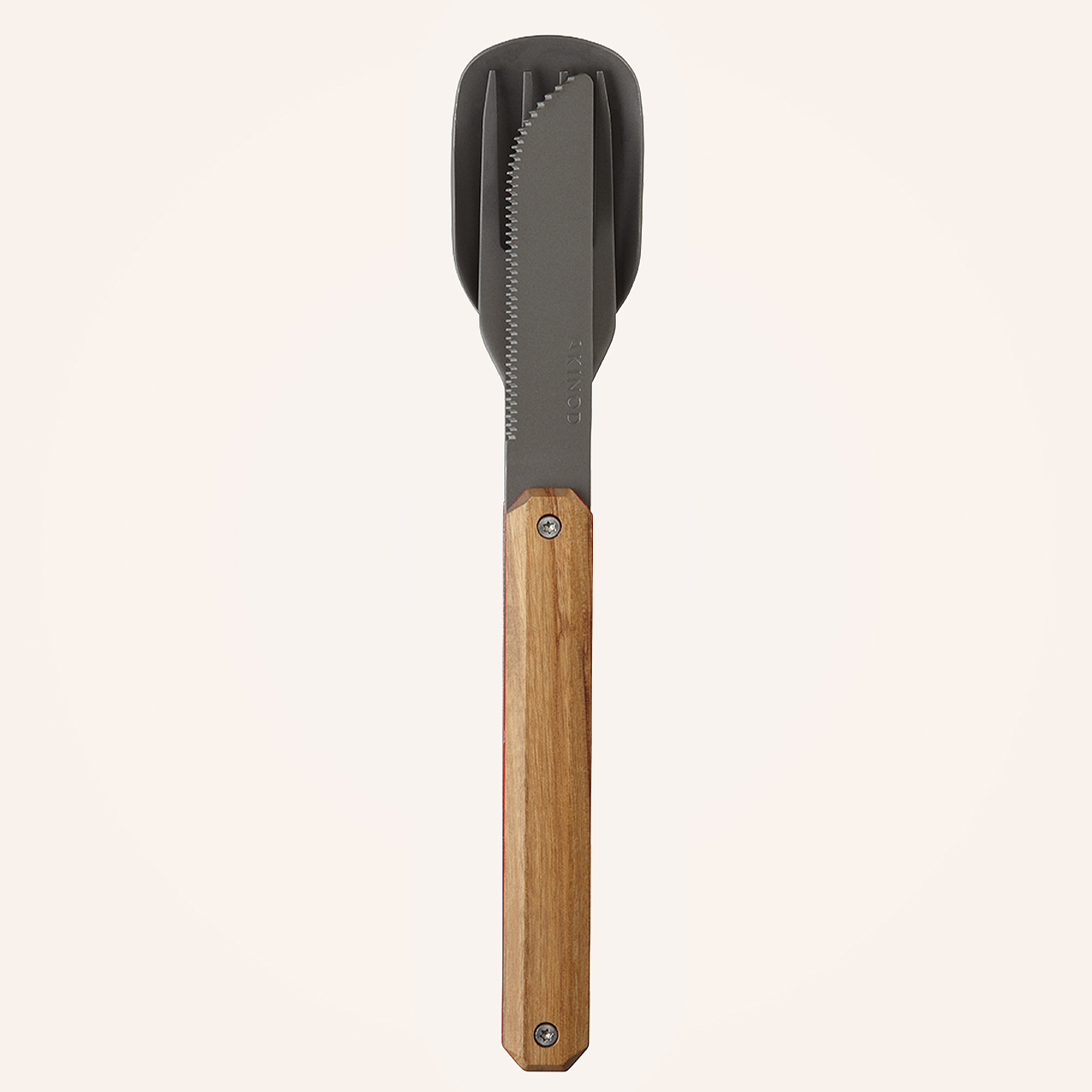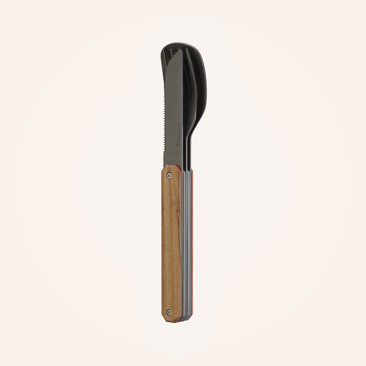 Couverts en acier inoxydable martensitique 2CR14,  finition titane gris anthracite. Composé d’une grande cuillère, d’une fourchette 4 dents et d’un couteau à lame micro dentée. Manche en bois d’olivier massif. Assemblage aimanté.
