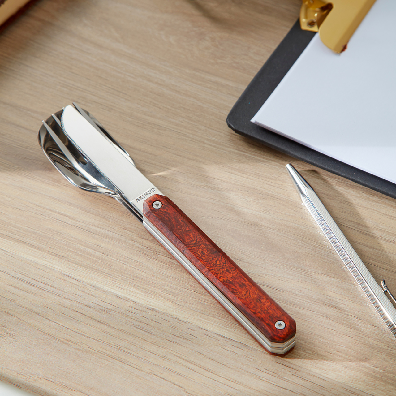 Couverts en acier inoxydable martensitique 2CR14, finition poli miroir. Composé d’une grande cuillère, d’une fourchette 4 dents et d’un couteau à lame micro dentée. Manche en Bois Corail. Assemblage aimanté. Livré avec étui de transport en polypropylène rigide (PP).
