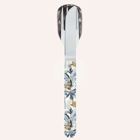 Couverts en acier inoxydable martensitique 2CR14, finition poli miroir. Composé d’une grande cuillère, d’une fourchette 4 dents et d’un couteau à lame micro dentée. Manche en polymère (PC) transparent décoré. Assemblage aimanté. Livré avec étui de transport en polypropylène rigide (PP). Compatible lave-vaisselle.