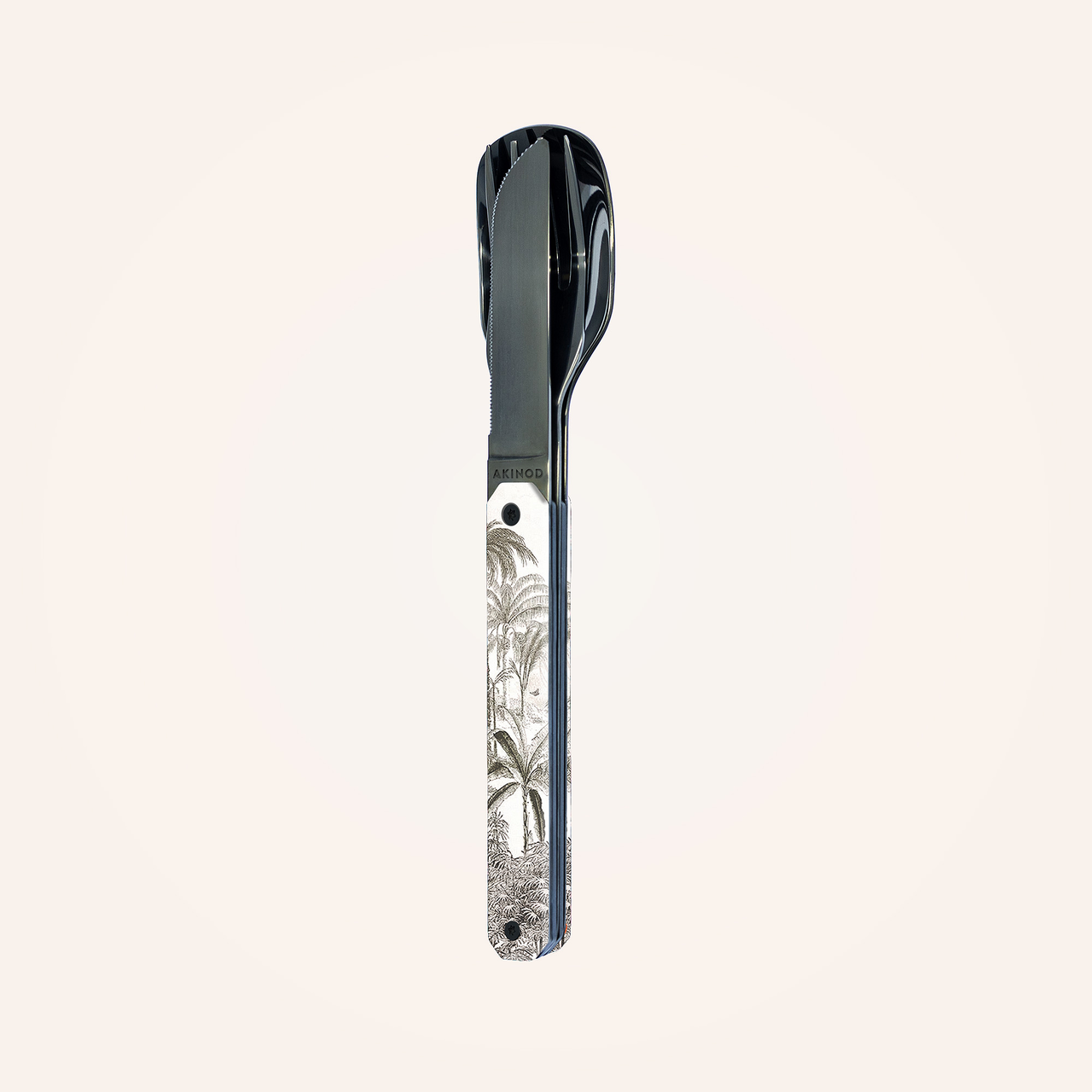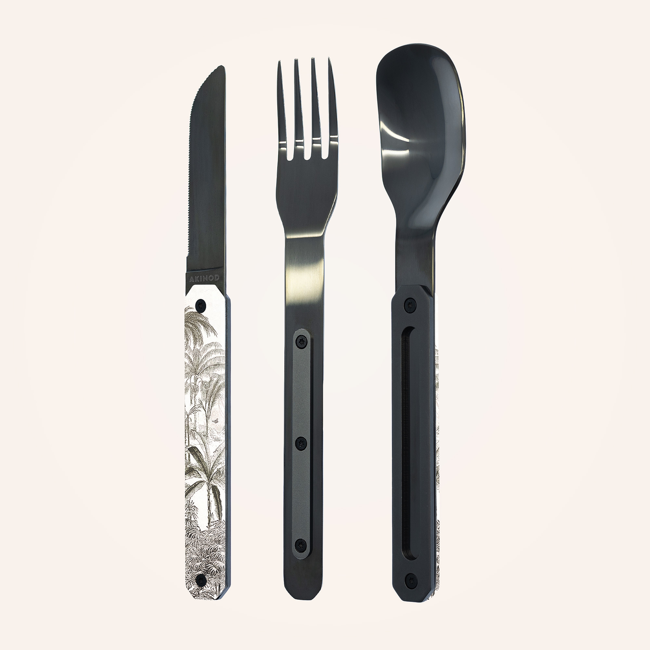 Couverts en acier inoxydable martensitique 2CR14, finition poli miroir noir. Composé d’une grande cuillère, d’une fourchette 4 dents et d’un couteau à lame micro dentée. Manche en polymère (PC) transparent décoré. Assemblage aimanté. Livré avec étui de transport en polypropylène rigide (PP). Compatible lave-vaisselle.