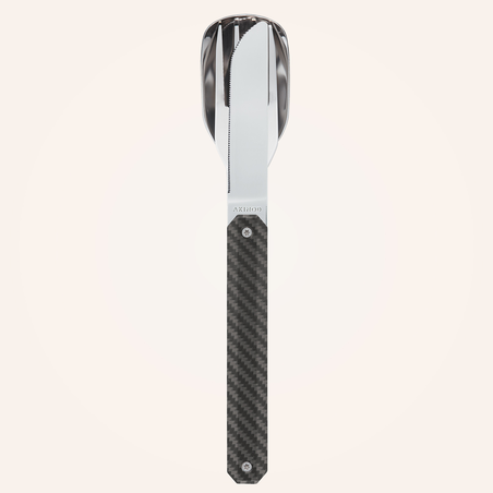 Couverts en acier inoxydable martensitique 2CR14, finition poli miroir. Composé d’une grande cuillère, d’une fourchette 4 dents et d’un couteau à lame micro dentée. Manche en polymère (PC) transparent décoré. Assemblage aimanté. Livré avec étui de transport en polypropylène rigide (PP). Compatible lave-vaisselle.